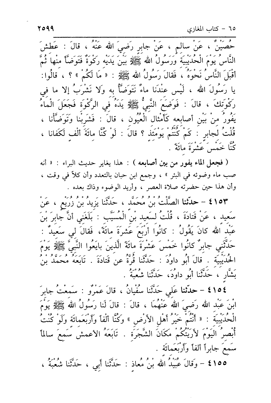 4153 - حَدَّثَنَا الصَّلْتُ بْنُ مُحَمَّدٍ، حَدَّثَنَا يَزِيدُ بْنُ زُرَيْعٍ، عَنْ سَعِيدٍ، عَنْ قَتَادَةَ، قُلْتُ لِسَعِيدِ بْنِ المُسَيِّبِ: بَلَغَنِي أَنَّ جَابِرَ بْنَ عَبْدِ اللَّهِ كَانَ يَقُولُ: «كَانُوا أَرْبَعَ عَشْرَةَ مِائَةً»، فَقَالَ لِي سَعِيدٌ: حَدَّثَنِي جَابِرٌ: «كَانُوا خَمْسَ عَشْرَةَ مِائَةً، الَّذِينَ بَايَعُوا النَّبِيَّ صَلَّى اللهُ عَلَيْهِ وَسَلَّمَ يَوْمَ الحُدَيْبِيَةِ» تَابَعَهُ أَبُو دَاوُدَ، حَدَّثَنَا قُرَّةُ، عَنْ قَتَادَةَ.