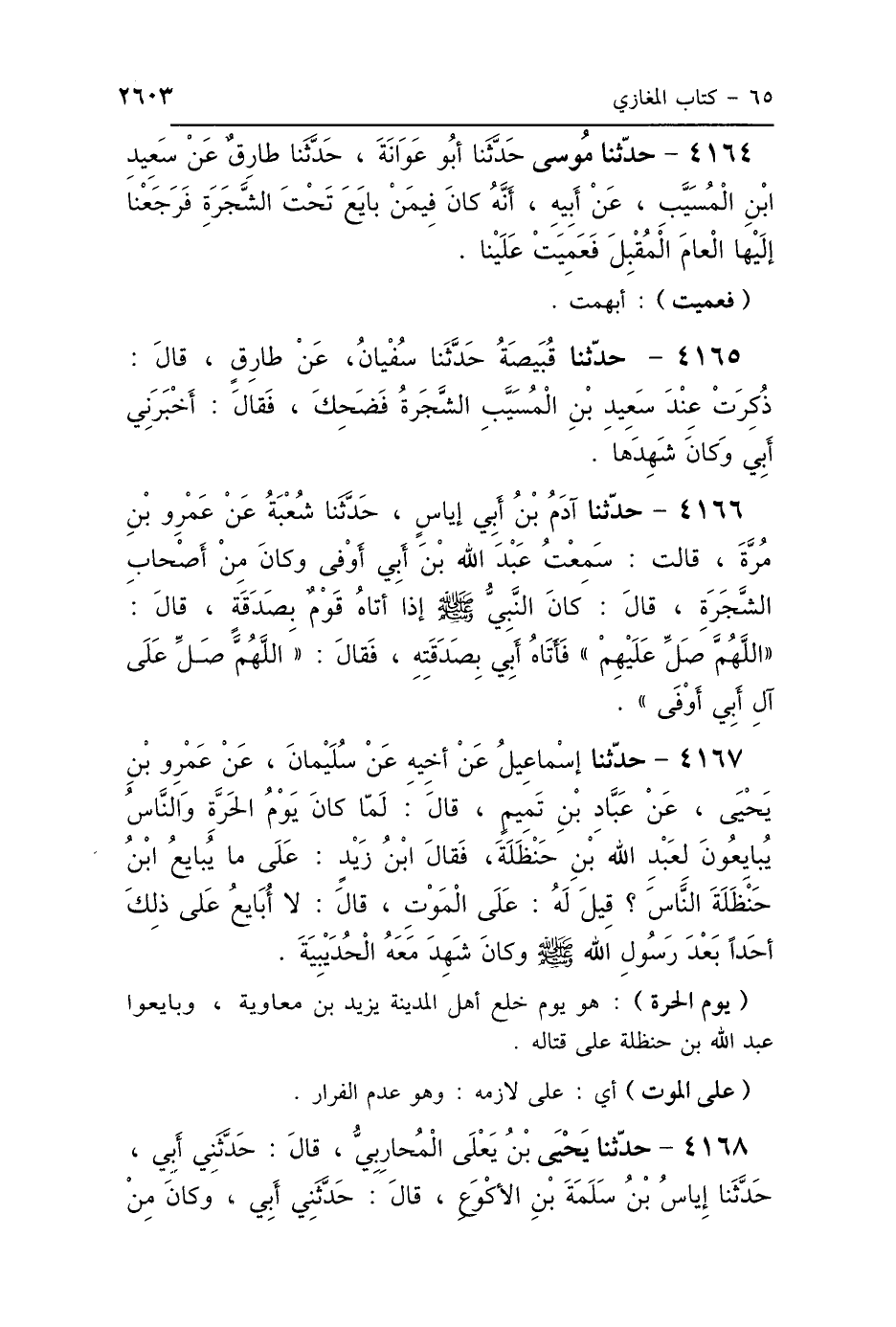 4164 - حَدَّثَنَا مُوسَى، حَدَّثَنَا أَبُو عَوَانَةَ، حَدَّثَنَا طَارِقٌ، عَنْ سَعِيدِ بْنِ المُسَيِّبِ، عَنْ أَبِيهِ، «أَنَّهُ كَانَ مِمَّنْ بَايَعَ تَحْتَ الشَّجَرَةِ، فَرَجَعْنَا إِلَيْهَا العَامَ المُقْبِلَ فَعَمِيَتْ عَلَيْنَا».