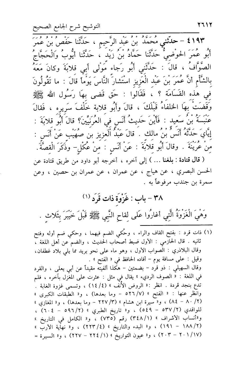 4193 - حَدَّثَنِي مُحَمَّدُ بْنُ عَبْدِ الرَّحِيمِ، حَدَّثَنَا حَفْصُ بْنُ عُمَرَ أَبُو عُمَرَ الحَوْضِيُّ، حَدَّثَنَا حَمَّادُ بْنُ زَيْدٍ، حَدَّثَنَا أَيُّوبُ، وَالحَجَّاجُ الصَّوَّافُ، قَالَ: حَدَّثَنِي أَبُو رَجَاءٍ، مَوْلَى أَبِي قِلاَبَةَ، وَكَانَ مَعَهُ بِالشَّأْمِ: أَنَّ عُمَرَ بْنَ عَبْدِ العَزِيزِ، اسْتَشَارَ النَّاسَ يَوْمًا، قَالَ: مَا تَقُولُونَ فِي هَذِهِ القَسَامَةِ؟ فَقَالُوا: «حَقٌّ قَضَى بِهَا رَسُولُ اللَّهِ صَلَّى اللهُ عَلَيْهِ وَسَلَّمَ، وَقَضَتْ بِهَا الخُلَفَاءُ قَبْلَكَ» قَالَ: وَأَبُو قِلاَبَةَ خَلْفَ سَرِيرِهِ، فَقَالَ عَنْبَسَةُ بْنُ سَعِيدٍ فَأَيْنَ حَدِيثُ أَنَسٍ فِي العُرَنِيِّينَ قَالَ أَبُو قِلاَبَةَ، إِيَّايَ حَدَّثَهُ أَنَسُ بْنُ مَالِكٍ، قَالَ عَبْدُ العَزِيزِ بْنُ صُهَيْبٍ، عَنْ أَنَسٍ، مِنْ عُرَيْنَةَ، وَقَالَ أَبُو قِلاَبَةَ، عَنْ أَنَسٍ، مِنْ عُكْلٍ ذَكَرَ القِصَّةَ.