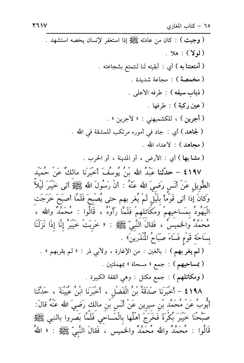 4197 - حَدَّثَنَا عَبْدُ اللَّهِ بْنُ يُوسُفَ، أَخْبَرَنَا مَالِكٌ، عَنْ حُمَيْدٍ الطَّوِيلِ، عَنْ أَنَسٍ رَضِيَ اللَّهُ عَنْهُ، أَنَّ رَسُولَ اللَّهِ صَلَّى اللهُ عَلَيْهِ وَسَلَّمَ أَتَى خَيْبَرَ لَيْلًا، وَكَانَ إِذَا أَتَى قَوْمًا بِلَيْلٍ لَمْ يُغِرْ بِهِمْ حَتَّى يُصْبِحَ، فَلَمَّا أَصْبَحَ خَرَجَتِ اليَهُودُ بِمَسَاحِيهِمْ، وَمَكَاتِلِهِمْ فَلَمَّا رَأَوْهُ قَالُوا: مُحَمَّدٌ وَاللَّهِ، مُحَمَّدٌ وَالخَمِيسُ، فَقَالَ النَّبِيُّ صَلَّى اللهُ عَلَيْهِ وَسَلَّمَ: " خَرِبَتْ خَيْبَرُ، إِنَّا إِذَا نَزَلْنَا بِسَاحَةِ قَوْمٍ {فَسَاءَ صَبَاحُ المُنْذَرِينَ} [الصافات: 177] ".