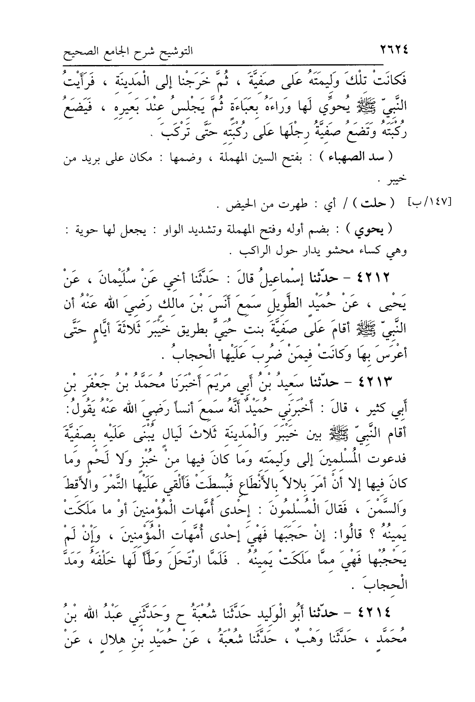 4213 - حَدَّثَنَا سَعِيدُ بْنُ أَبِي مَرْيَمَ، أَخْبَرَنَا مُحَمَّدُ بْنُ جَعْفَرِ بْنِ أَبِي كَثِيرٍ، قَالَ: أَخْبَرَنِي حُمَيْدٌ، أَنَّهُ سَمِعَ أَنَسًا رَضِيَ اللَّهُ عَنْهُ، يَقُولُ: «أَقَامَ النَّبِيُّ صَلَّى اللهُ عَلَيْهِ وَسَلَّمَ بَيْنَ خَيْبَرَ، وَالمَدِينَةِ ثَلاَثَ لَيَالٍ يُبْنَى عَلَيْهِ بِصَفِيَّةَ»، فَدَعَوْتُ المُسْلِمِينَ إِلَى وَلِيمَتِهِ، وَمَا كَانَ فِيهَا مِنْ خُبْزٍ وَلاَ لَحْمٍ، وَمَا كَانَ فِيهَا إِلَّا أَنْ أَمَرَ بِلاَلًا بِالأَنْطَاعِ فَبُسِطَتْ، فَأَلْقَى عَلَيْهَا التَّمْرَ وَالأَقِطَ وَالسَّمْنَ، فَقَالَ المُسْلِمُونَ: إِحْدَى أُمَّهَاتِ المُؤْمِنِينَ، أَوْ مَا مَلَكَتْ يَمِينُهُ؟ قَالُوا: إِنْ حَجَبَهَا فَهِيَ إِحْدَى أُمَّهَاتِ المُؤْمِنِينَ، وَإِنْ لَمْ يَحْجُبْهَا فَهِيَ مِمَّا مَلَكَتْ يَمِينُهُ، فَلَمَّا ارْتَحَلَ وَطَّأَ لَهَا خَلْفَهُ، وَمَدَّ الحِجَابَ.