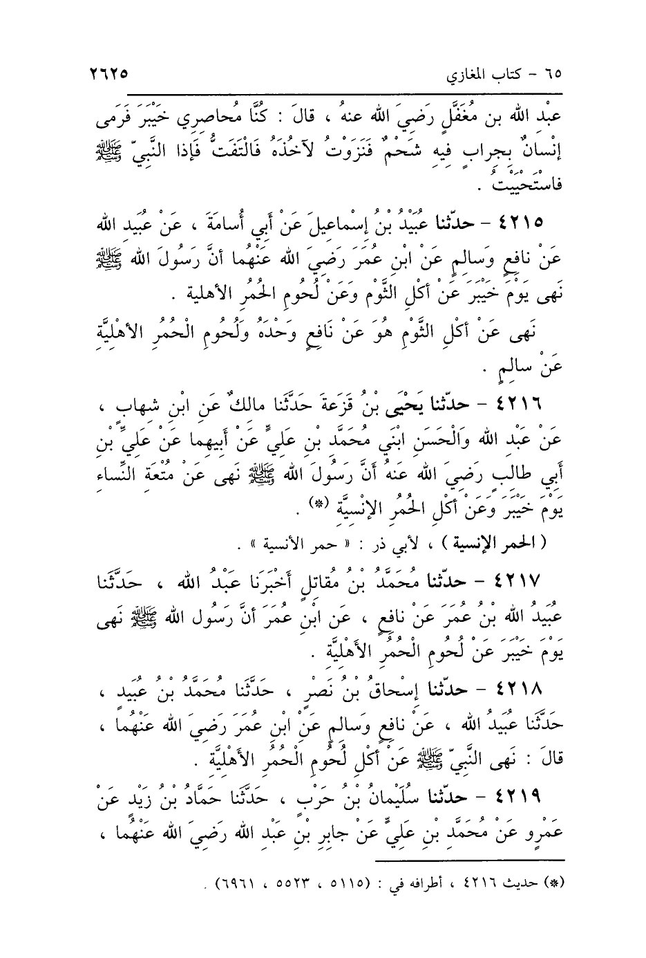 4215 - حَدَّثَنِي عُبَيْدُ بْنُ إِسْمَاعِيلَ، عَنْ أَبِي أُسَامَةَ، عَنْ عُبَيْدِ اللَّهِ، عَنْ نَافِعٍ، وَسَالِمٍ، عَنِ ابْنِ عُمَرَ رَضِيَ اللَّهُ عَنْهُمَا، أَنَّ رَسُولَ اللَّهِ صَلَّى اللهُ عَلَيْهِ وَسَلَّمَ «نَهَى يَوْمَ خَيْبَرَ عَنْ أَكْلِ الثُّومِ، وَعَنْ لُحُومِ الحُمُرِ الأَهْلِيَّةِ» نَهَى عَنْ أَكْلِ الثُّومِ «هُوَ عَنْ نَافِعٍ وَحْدَهُ،» وَلُحُومِ الحُمُرِ الأَهْلِيَّةِ " عَنْ سَالِمٍ.