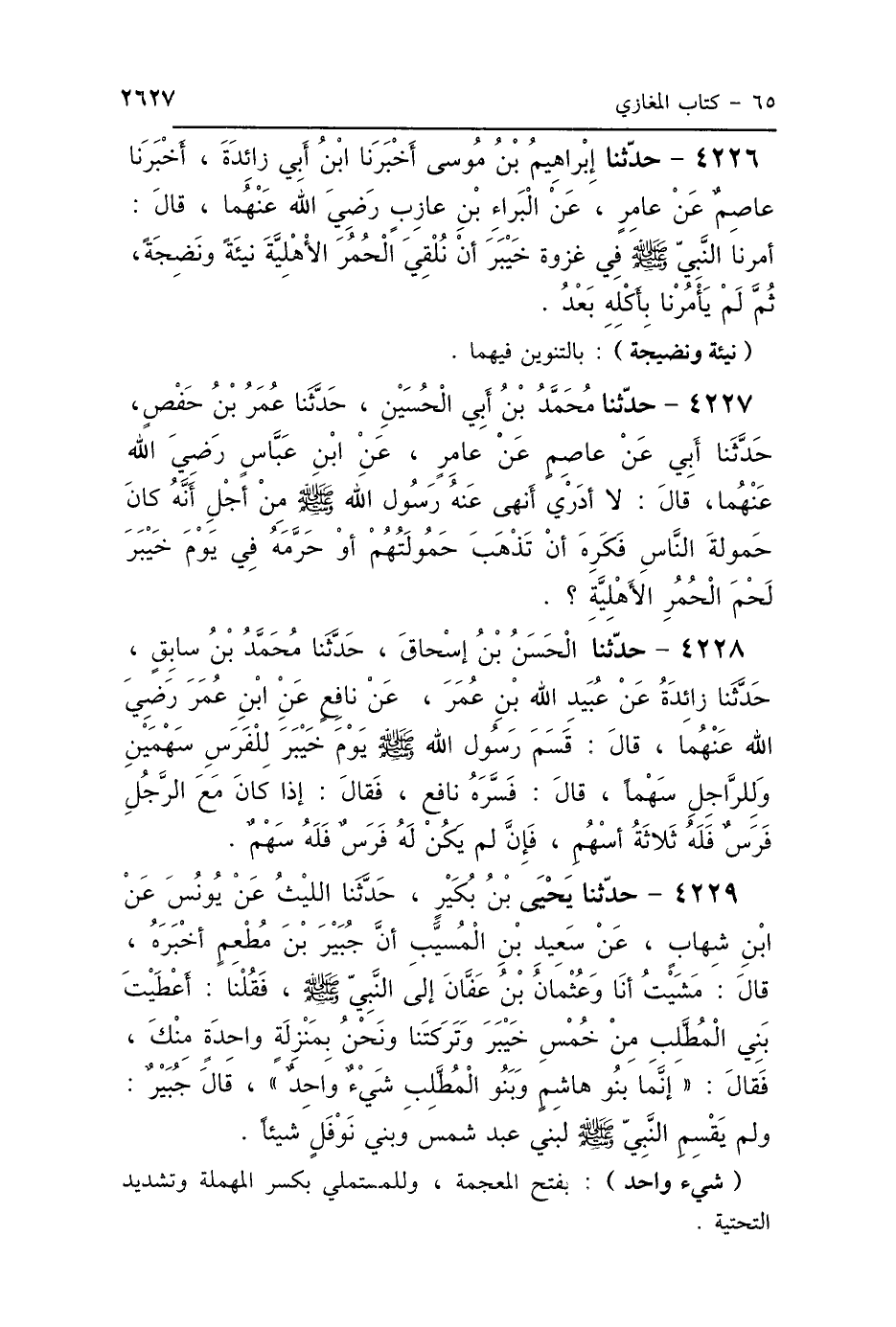 4226 - حَدَّثَنِي إِبْرَاهِيمُ بْنُ مُوسَى، أَخْبَرَنَا ابْنُ أَبِي زَائِدَةَ، أَخْبَرَنَا عَاصِمٌ، عَنْ عَامِرٍ، عَنِ البَرَاءِ بْنِ عَازِبٍ رَضِيَ اللَّهُ عَنْهُمَا، قَالَ: أَمَرَنَا النَّبِيُّ صَلَّى اللهُ عَلَيْهِ وَسَلَّمَ فِي غَزْوَةِ خَيْبَرَ «أَنْ نُلْقِيَ الحُمُرَ الأَهْلِيَّةَ نِيئَةً وَنَضِيجَةً، ثُمَّ لَمْ يَأْمُرْنَا بِأَكْلِهِ بَعْدُ».