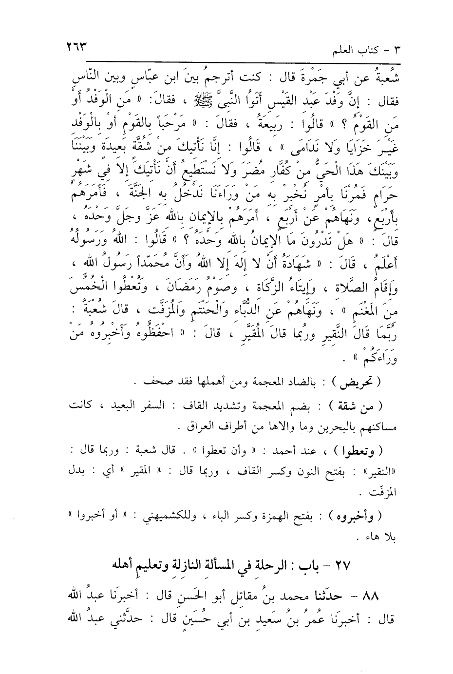 شُعْبَةُ، عَنْ أَبِي جَمْرَةَ، قَالَ: كُنْتُ أُتَرْجِمُ بَيْنَ ابْنِ عَبَّاسٍ وَبَيْنَ النَّاسِ، فَقَالَ: إِنَّ وَفْدَ عَبْدِ القَيْسِ أَتَوُا النَّبِيَّ صَلَّى اللهُ عَلَيْهِ وَسَلَّمَ فَقَالَ: «مَنِ الوَفْدُ أَوْ مَنِ القَوْمُ» قَالُوا: رَبِيعَةُ فَقَالَ: «مَرْحَبًا بِالقَوْمِ أَوْ بِالوَفْدِ، غَيْرَ خَزَايَا وَلاَ نَدَامَى» قَالُوا: إِنَّا نَأْتِيكَ مِنْ شُقَّةٍ بَعِيدَةٍ، وَبَيْنَنَا وَبَيْنَكَ هَذَا الحَيُّ مِنْ كُفَّارِ مُضَرَ، وَلاَ نَسْتَطِيعُ أَنْ نَأْتِيَكَ إِلَّا فِي شَهْرٍ حَرَامٍ، فَمُرْنَا بِأَمْرٍ نُخْبِرُ بِهِ مَنْ وَرَاءَنَا، نَدْخُلُ بِهِ الجَنَّةَ. فَأَمَرَهُمْ بِأَرْبَعٍ وَنَهَاهُمْ عَنْ أَرْبَعٍ: أَمَرَهُمْ بِالإِيمَانِ بِاللَّهِ عَزَّ وَجَلَّ وَحْدَهُ، قَالَ: «هَلْ تَدْرُونَ مَا الإِيمَانُ بِاللَّهِ وَحْدَهُ؟» قَالُوا: اللَّهُ وَرَسُولُهُ أَعْلَمُ، قَالَ: «شَهَادَةُ أَنْ لاَ إِلَهَ إِلَّا اللَّهُ، وَأَنَّ مُحَمَّدًا رَسُولُ اللَّهِ، وَإِقَامُ الصَّلاَةِ، وَإِيتَاءُ الزَّكَاةِ، وَصَوْمُ رَمَضَانَ، وَتُعْطُوا الخُمُسَ مِنَ المَغْنَمِ» وَنَهَاهُمْ عَنِ الدُّبَّاءِ وَالحَنْتَمِ وَالمُزَفَّتِ " قَالَ شُعْبَةُ: رُبَّمَا قَالَ: «النَّقِيرِ» وَرُبَّمَا قَالَ: «المُقَيَّرِ» قَالَ: «احْفَظُوهُ وَأَخْبِرُوهُ مَنْ وَرَاءَكُمْ».