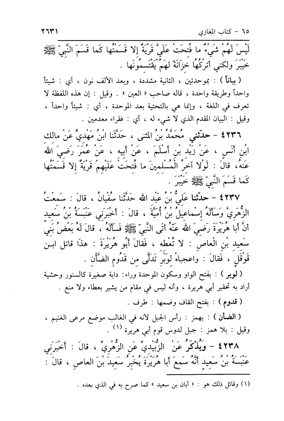 لَيْسَ لَهُمْ شَيْءٌ، مَا فُتِحَتْ عَلَيَّ قَرْيَةٌ إِلَّا قَسَمْتُهَا كَمَا قَسَمَ النَّبِيُّ صَلَّى اللهُ عَلَيْهِ وَسَلَّمَ خَيْبَرَ وَلَكِنِّي أَتْرُكُهَا خِزَانَةً لَهُمْ يَقْتَسِمُونَهَا».