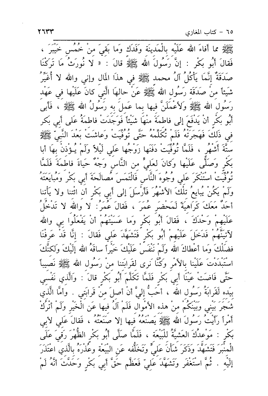 صَلَّى اللهُ عَلَيْهِ وَسَلَّمَ مِمَّا أَفَاءَ اللَّهُ عَلَيْهِ بِالْمَدِينَةِ، وَفَدَكٍ وَمَا بَقِيَ مِنْ خُمُسِ خَيْبَرَ فَقَالَ أَبُو بَكْرٍ: إِنَّ رَسُولَ اللَّهِ صَلَّى اللهُ عَلَيْهِ وَسَلَّمَ قَالَ: «لاَ نُورَثُ، مَا تَرَكْنَا صَدَقَةٌ، إِنَّمَا يَأْكُلُ آلُ مُحَمَّدٍ - صَلَّى اللهُ عَلَيْهِ وَسَلَّمَ - فِي هَذَا المَالِ»، وَإِنِّي وَاللَّهِ لاَ أُغَيِّرُ شَيْئًا مِنْ صَدَقَةِ رَسُولِ اللَّهِ صَلَّى اللهُ عَلَيْهِ وَسَلَّمَ عَنْ حَالِهَا الَّتِي كَانَ عَلَيْهَا فِي عَهْدِ رَسُولِ اللَّهِ صَلَّى اللهُ عَلَيْهِ وَسَلَّمَ، وَلَأَعْمَلَنَّ فِيهَا بِمَا عَمِلَ بِهِ رَسُولُ اللَّهِ صَلَّى اللهُ عَلَيْهِ وَسَلَّمَ. فَأَبَى أَبُو بَكْرٍ أَنْ يَدْفَعَ إِلَى فَاطِمَةَ مِنْهَا شَيْئًا، فَوَجَدَتْ فَاطِمَةُ عَلَى أَبِي بَكْرٍ فِي ذَلِكَ، فَهَجَرَتْهُ فَلَمْ تُكَلِّمْهُ حَتَّى تُوُفِّيَتْ، وَعَاشَتْ بَعْدَ النَّبِيِّ صَلَّى اللهُ عَلَيْهِ وَسَلَّمَ سِتَّةَ أَشْهُرٍ، فَلَمَّا تُوُفِّيَتْ دَفَنَهَا زَوْجُهَا عَلِيٌّ لَيْلًا، وَلَمْ يُؤْذِنْ بِهَا أَبَا بَكْرٍ وَصَلَّى عَلَيْهَا، وَكَانَ لِعَلِيٍّ مِنَ النَّاسِ وَجْهٌ حَيَاةَ فَاطِمَةَ، فَلَمَّا تُوُفِّيَتِ اسْتَنْكَرَ عَلِيٌّ وُجُوهَ النَّاسِ، فَالْتَمَسَ مُصَالَحَةَ أَبِي بَكْرٍ وَمُبَايَعَتَهُ، وَلَمْ يَكُنْ يُبَايِعُ تِلْكَ الأَشْهُرَ، فَأَرْسَلَ إِلَى أَبِي بَكْرٍ: أَنِ ائْتِنَا وَلاَ يَأْتِنَا أَحَدٌ مَعَكَ، كَرَاهِيَةً لِمَحْضَرِ عُمَرَ، فَقَالَ عُمَرُ: لاَ وَاللَّهِ لاَ تَدْخُلُ عَلَيْهِمْ وَحْدَكَ، فَقَالَ أَبُو بَكْرٍ: وَمَا عَسَيْتَهُمْ أَنْ يَفْعَلُوا بِي، وَاللَّهِ لآتِيَنَّهُمْ، فَدَخَلَ عَلَيْهِمْ أَبُو بَكْرٍ، فَتَشَهَّدَ عَلِيٌّ، فَقَالَ: إِنَّا قَدْ عَرَفْنَا فَضْلَكَ وَمَا أَعْطَاكَ اللَّهُ، وَلَمْ نَنْفَسْ عَلَيْكَ خَيْرًا سَاقَهُ اللَّهُ إِلَيْكَ، وَلَكِنَّكَ اسْتَبْدَدْتَ عَلَيْنَا بِالأَمْرِ، وَكُنَّا نَرَى لِقَرَابَتِنَا مِنْ رَسُولِ اللَّهِ صَلَّى اللهُ عَلَيْهِ وَسَلَّمَ نَصِيبًا، حَتَّى فَاضَتْ عَيْنَا أَبِي بَكْرٍ، فَلَمَّا تَكَلَّمَ أَبُو بَكْرٍ قَالَ: وَالَّذِي نَفْسِي بِيَدِهِ لَقَرَابَةُ رَسُولِ اللَّهِ صَلَّى اللهُ عَلَيْهِ وَسَلَّمَ أَحَبُّ إِلَيَّ أَنْ أَصِلَ مِنْ قَرَابَتِي، وَأَمَّا الَّذِي شَجَرَ بَيْنِي وَبَيْنَكُمْ مِنْ هَذِهِ الأَمْوَالِ، فَلَمْ آلُ فِيهَا عَنِ الخَيْرِ، وَلَمْ أَتْرُكْ أَمْرًا رَأَيْتُ رَسُولَ اللَّهِ صَلَّى اللهُ عَلَيْهِ وَسَلَّمَ يَصْنَعُهُ فِيهَا إِلَّا صَنَعْتُهُ، فَقَالَ عَلِيٌّ لِأَبِي بَكْرٍ: مَوْعِدُكَ العَشِيَّةَ لِلْبَيْعَةِ، فَلَمَّا صَلَّى أَبُو بَكْرٍ الظُّهْرَ رَقِيَ عَلَى المِنْبَرِ، فَتَشَهَّدَ، وَذَكَرَ شَأْنَ عَلِيٍّ وَتَخَلُّفَهُ عَنِ البَيْعَةِ، وَعُذْرَهُ بِالَّذِي اعْتَذَرَ إِلَيْهِ، ثُمَّ اسْتَغْفَرَ وَتَشَهَّدَ عَلِيٌّ، فَعَظَّمَ حَقَّ أَبِي بَكْرٍ، وَحَدَّثَ: أَنَّهُ لَمْ