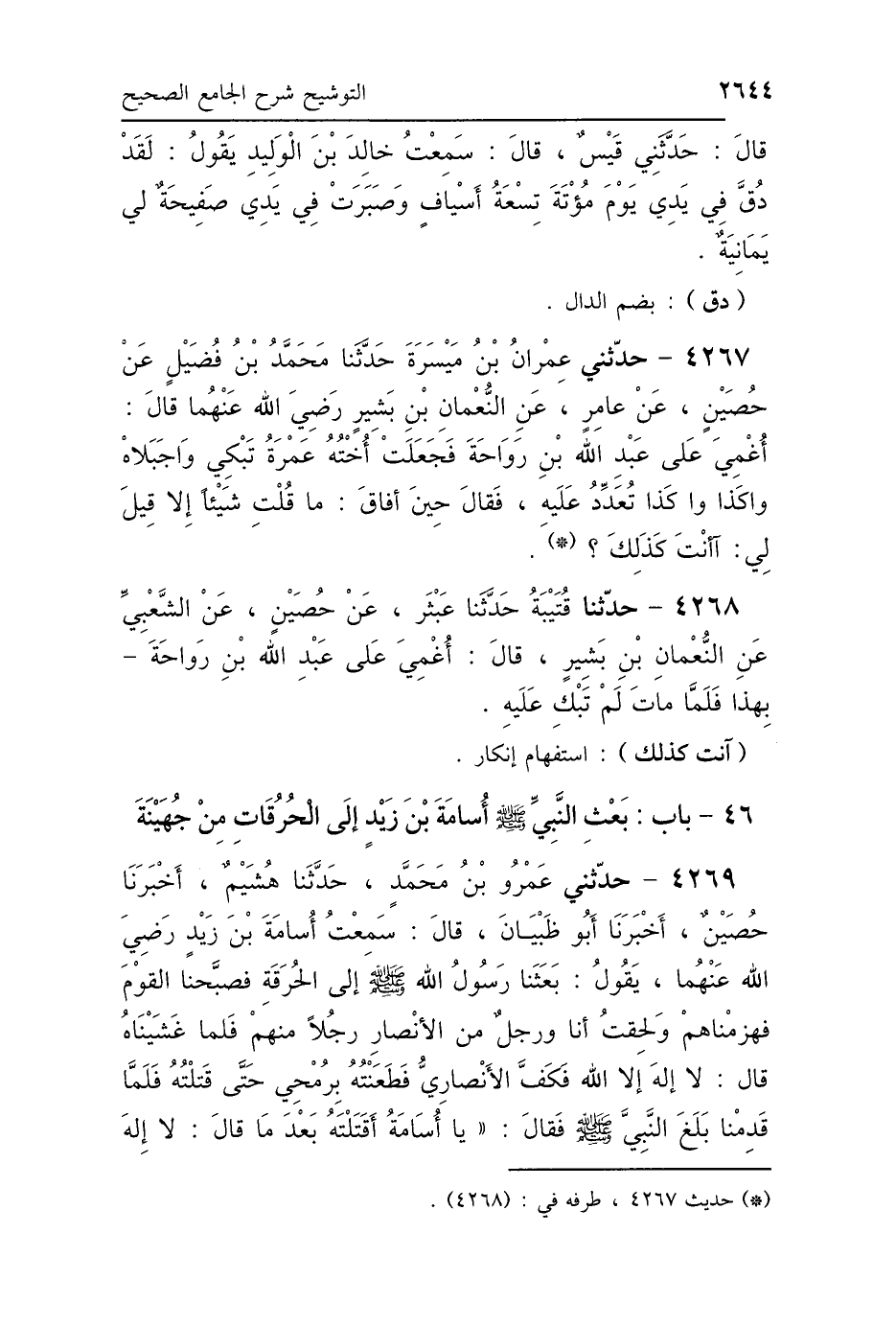 4269 - حَدَّثَنِي عَمْرُو بْنُ مُحَمَّدٍ، حَدَّثَنَا هُشَيْمٌ، أَخْبَرَنَا حُصَيْنٌ، أَخْبَرَنَا أَبُو ظَبْيَانَ، قَالَ: سَمِعْتُ أُسَامَةَ بْنَ زَيْدٍ رَضِيَ اللَّهُ عَنْهُمَا، يَقُولُ: بَعَثَنَا رَسُولُ اللَّهِ صَلَّى اللهُ عَلَيْهِ وَسَلَّمَ إِلَى الحُرَقَةِ، فَصَبَّحْنَا القَوْمَ فَهَزَمْنَاهُمْ، وَلَحِقْتُ أَنَا وَرَجُلٌ مِنَ الأَنْصَارِ رَجُلًا مِنْهُمْ، فَلَمَّا غَشِينَاهُ، قَالَ: لاَ إِلَهَ إِلَّا اللَّهُ فَكَفَّ الأَنْصَارِيُّ فَطَعَنْتُهُ بِرُمْحِي حَتَّى قَتَلْتُهُ، فَلَمَّا قَدِمْنَا بَلَغَ النَّبِيَّ صَلَّى اللهُ عَلَيْهِ وَسَلَّمَ، فَقَالَ: «يَا أُسَامَةُ، أَقَتَلْتَهُ بَعْدَ مَا قَالَ لاَ إِلَهَ