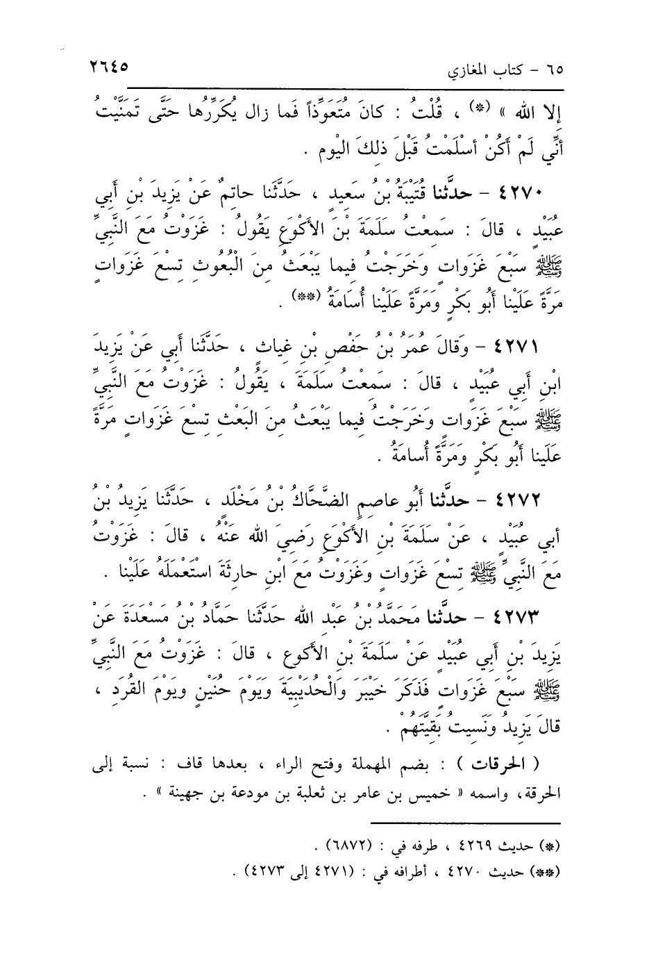 4273 - حَدَّثَنَا مُحَمَّدُ بْنُ عَبْدِ اللَّهِ، حَدَّثَنَا حَمَّادُ بْنُ مَسْعَدَةَ، عَنْ يَزِيدَ بْنِ أَبِي عُبَيْدٍ، عَنْ سَلَمَةَ بْنِ الأَكْوَعِ، قَالَ " غَزَوْتُ مَعَ النَّبِيِّ صَلَّى اللهُ عَلَيْهِ وَسَلَّمَ سَبْعَ غَزَوَاتٍ، فَذَكَرَ: خَيْبَرَ، وَالحُدَيْبِيَةَ، وَيَوْمَ حُنَيْنٍ، وَيَوْمَ القَرَدِ " قَالَ يَزِيدُ: «وَنَسِيتُ بَقِيَّتَهُمْ».