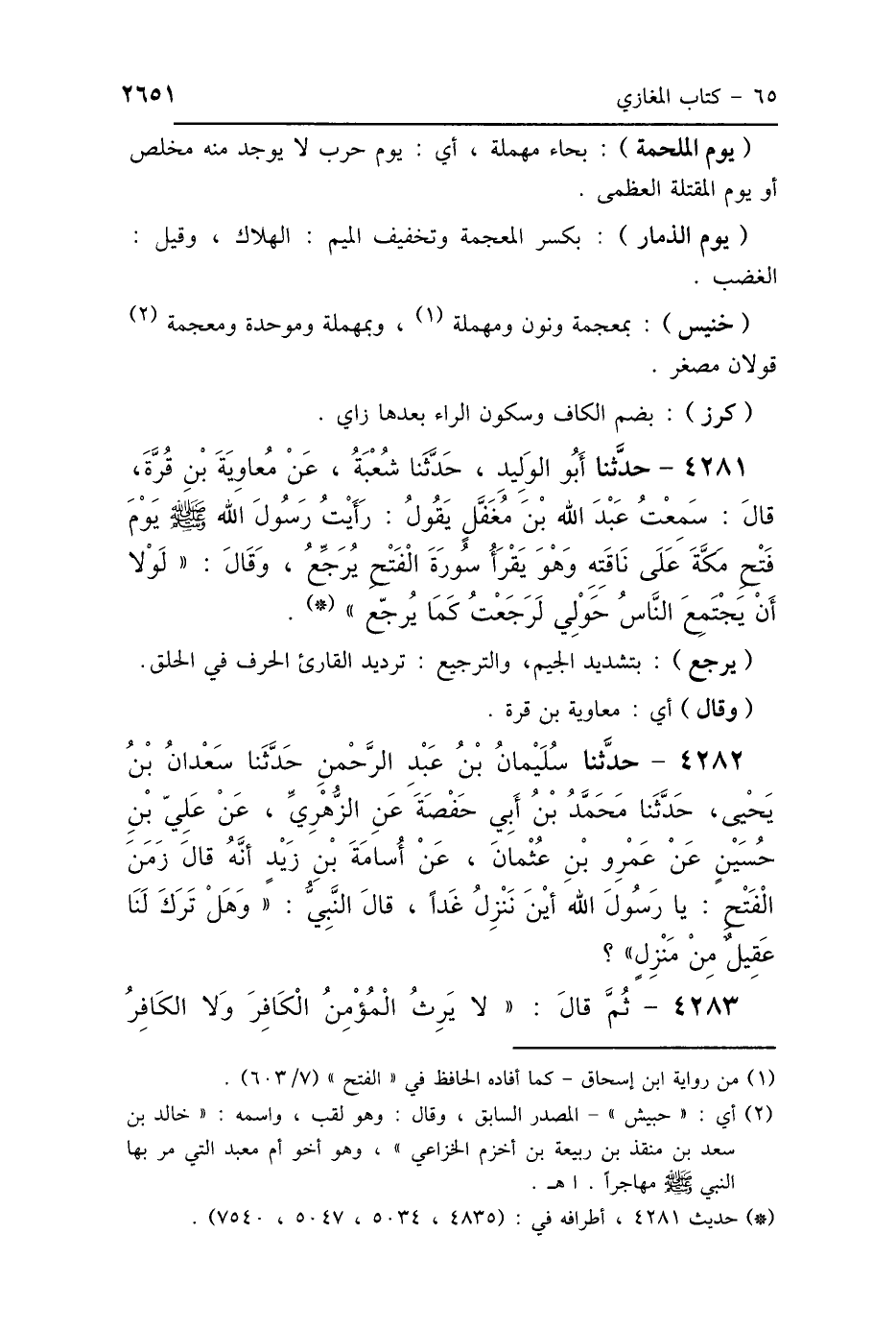 4281 - حَدَّثَنَا أَبُو الوَلِيدِ، حَدَّثَنَا شُعْبَةُ، عَنْ مُعَاوِيَةَ بْنِ قُرَّةَ، قَالَ: سَمِعْتُ عَبْدَ اللَّهِ بْنَ مُغَفَّلٍ، يَقُولُ: «رَأَيْتُ رَسُولَ اللَّهِ صَلَّى اللهُ عَلَيْهِ وَسَلَّمَ يَوْمَ فَتْحِ مَكَّةَ عَلَى نَاقَتِهِ، وَهُوَ يَقْرَأُ سُورَةَ الفَتْحِ يُرَجِّعُ». وَقَالَ: لَوْلاَ أَنْ يَجْتَمِعَ النَّاسُ حَوْلِي لَرَجَّعْتُ كَمَا رَجَّعَ.