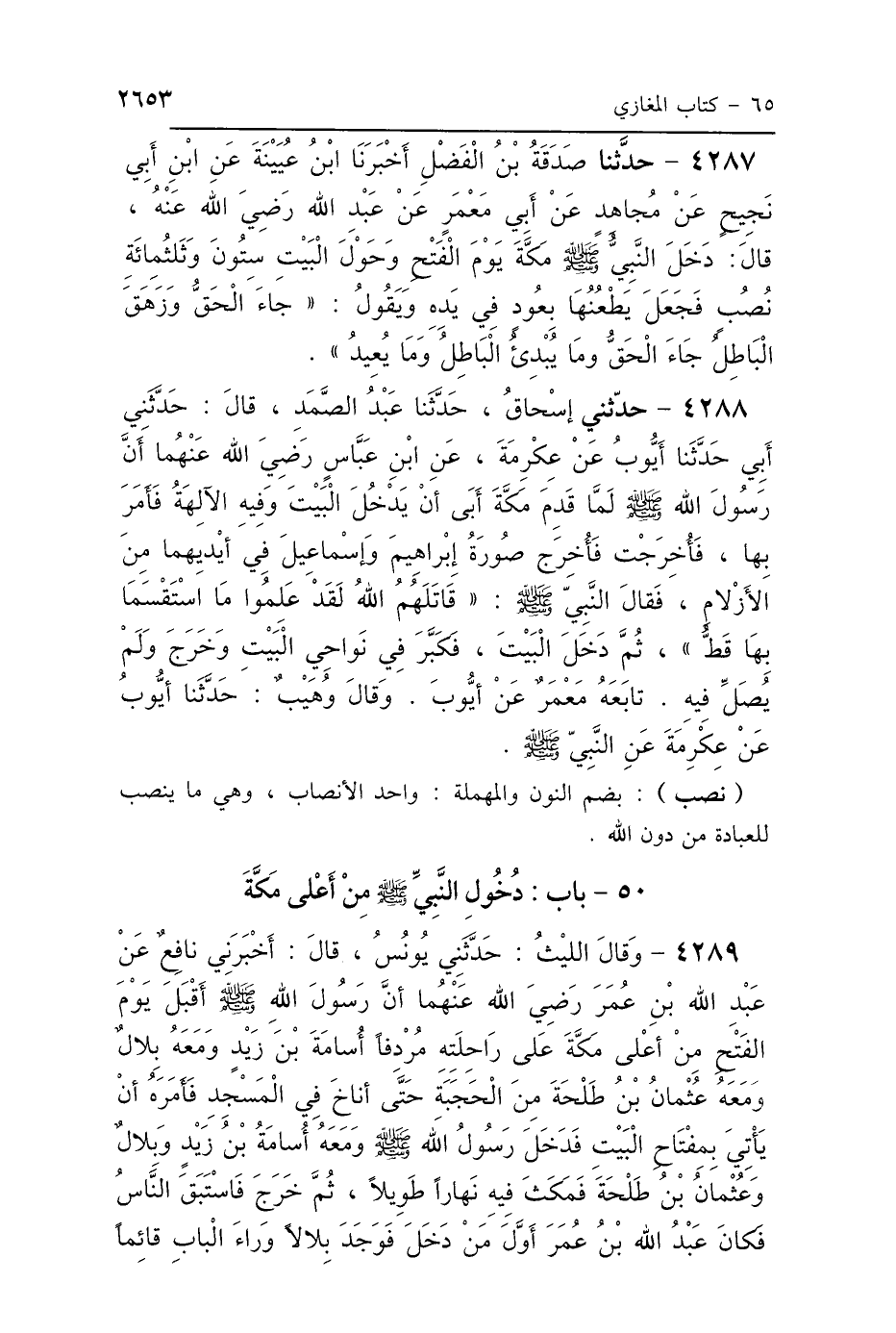 4287 - حَدَّثَنَا صَدَقَةُ بْنُ الفَضْلِ، أَخْبَرَنَا ابْنُ عُيَيْنَةَ، عَنِ ابْنِ أَبِي نَجِيحٍ، عَنْ مُجَاهِدٍ، عَنْ أَبِي مَعْمَرٍ، عَنْ عَبْدِ اللَّهِ رَضِيَ اللَّهُ عَنْهُ، قَالَ: دَخَلَ النَّبِيُّ صَلَّى اللهُ عَلَيْهِ وَسَلَّمَ مَكَّةَ يَوْمَ الفَتْحِ، وَحَوْلَ البَيْتِ سِتُّونَ وَثَلاَثُ مِائَةِ نُصُبٍ فَجَعَلَ يَطْعُنُهَا بِعُودٍ فِي يَدِهِ، وَيَقُولُ: «جَاءَ الحَقُّ وَزَهَقَ البَاطِلُ، جَاءَ الحَقُّ وَمَا يُبْدِئُ البَاطِلُ وَمَا يُعِيدُ».