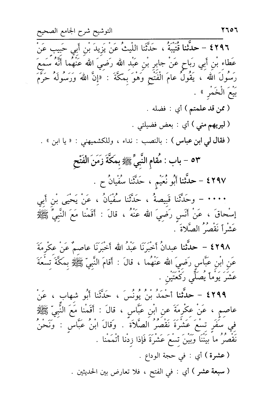 4297 - حَدَّثَنَا أَبُو نُعَيْمٍ، حَدَّثَنَا سُفْيَانُ، ح حَدَّثَنَا قَبِيصَةُ، حَدَّثَنَا سُفْيَانُ، عَنْ يَحْيَى بْنِ أَبِي إِسْحَاقَ، عَنْ أَنَسٍ رَضِيَ اللَّهُ عَنْهُ، قَالَ: «أَقَمْنَا مَعَ النَّبِيِّ صَلَّى اللهُ عَلَيْهِ وَسَلَّمَ عَشْرًا نَقْصُرُ الصَّلاَةَ».