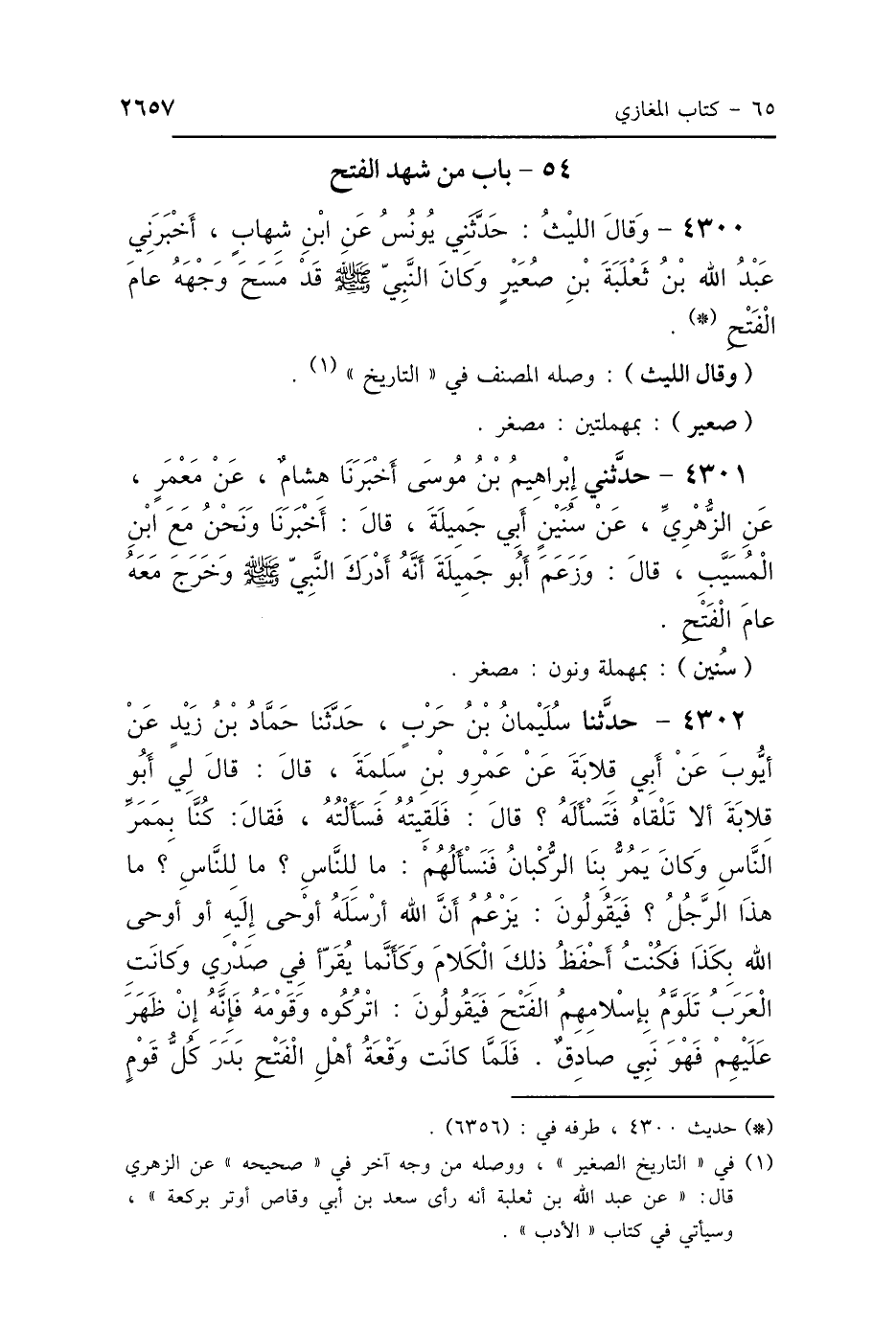 4300 - وَقَالَ اللَّيْثُ حَدَّثَنِي يُونُسُ، عَنِ ابْنِ شِهَابٍ، أَخْبَرَنِي عَبْدُ اللَّهِ بْنُ ثَعْلَبَةَ بْنِ صُعَيْرٍ، وَكَانَ النَّبِيُّ صَلَّى اللهُ عَلَيْهِ وَسَلَّمَ قَدْ مَسَحَ وَجْهَهُ عَامَ الفَتْحِ.