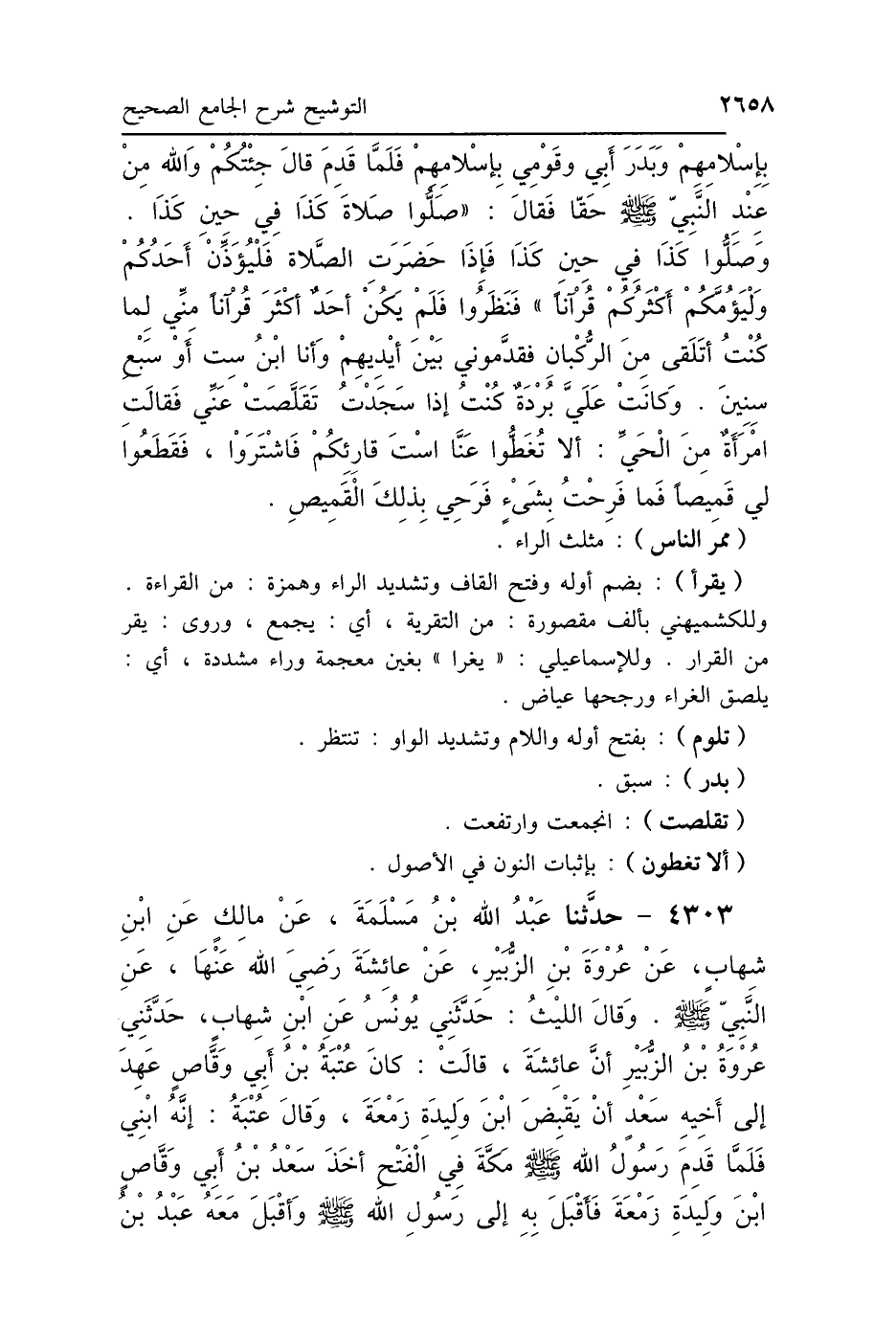 4303 - حَدَّثَنِي عَبْدُ اللَّهِ بْنُ مَسْلَمَةَ، عَنْ مَالِكٍ، عَنِ ابْنِ شِهَابٍ، عَنْ عُرْوَةَ بْنِ الزُّبَيْرِ، عَنْ عَائِشَةَ رَضِيَ اللَّهُ عَنْهَا، عَنِ النَّبِيِّ صَلَّى اللهُ عَلَيْهِ وَسَلَّمَ وَقَالَ اللَّيْثُ: حَدَّثَنِي يُونُسُ، عَنْ ابْنِ شِهَابٍ، أَخْبَرَنِي عُرْوَةُ بْنُ الزُّبَيْرِ، أَنَّ عَائِشَةَ قَالَتْ: كَانَ عُتْبَةُ بْنُ أَبِي وَقَّاصٍ عَهِدَ إِلَى أَخِيهِ سَعْدٍ: أَنْ يَقْبِضَ ابْنَ وَلِيدَةِ زَمْعَةَ، وَقَالَ عُتْبَةُ: إِنَّهُ ابْنِي، فَلَمَّا قَدِمَ رَسُولُ اللَّهِ صَلَّى اللهُ عَلَيْهِ وَسَلَّمَ مَكَّةَ فِي الفَتْحِ، أَخَذَ سَعْدُ بْنُ أَبِي وَقَّاصٍ ابْنَ وَلِيدَةِ زَمْعَةَ، فَأَقْبَلَ بِهِ إِلَى رَسُولِ اللَّهِ صَلَّى اللهُ عَلَيْهِ وَسَلَّمَ، وَأَقْبَلَ مَعَهُ عَبْدُ بْنُ