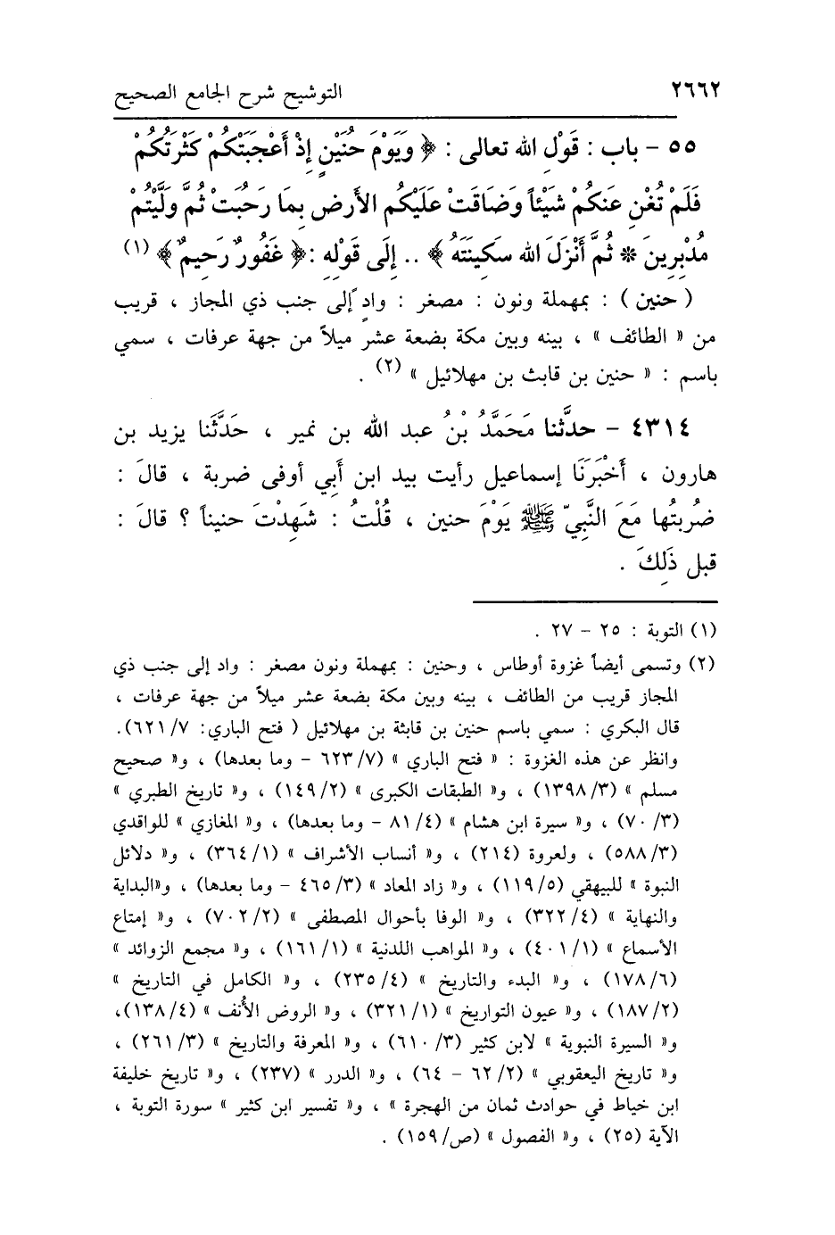 55 - بَابُ قَوْلِ اللَّهِ تَعَالَى: {وَيَوْمَ حُنَيْنٍ إِذْ أَعْجَبَتْكُمْ كَثْرَتُكُمْ فَلَمْ تُغْنِ عَنْكُمْ شَيْئًا وَضَاقَتْ عَلَيْكُمُ الأَرْضُ بِمَا رَحُبَتْ ثُمَّ وَلَّيْتُمْ مُدْبِرِينَ. ثُمَّ أَنْزَلَ اللَّهُ سَكِينَتَهُ} [التوبة: 26]- إِلَى قَوْلِهِ - {غَفُورٌ رَحِيمٌ} [البقرة: 173]