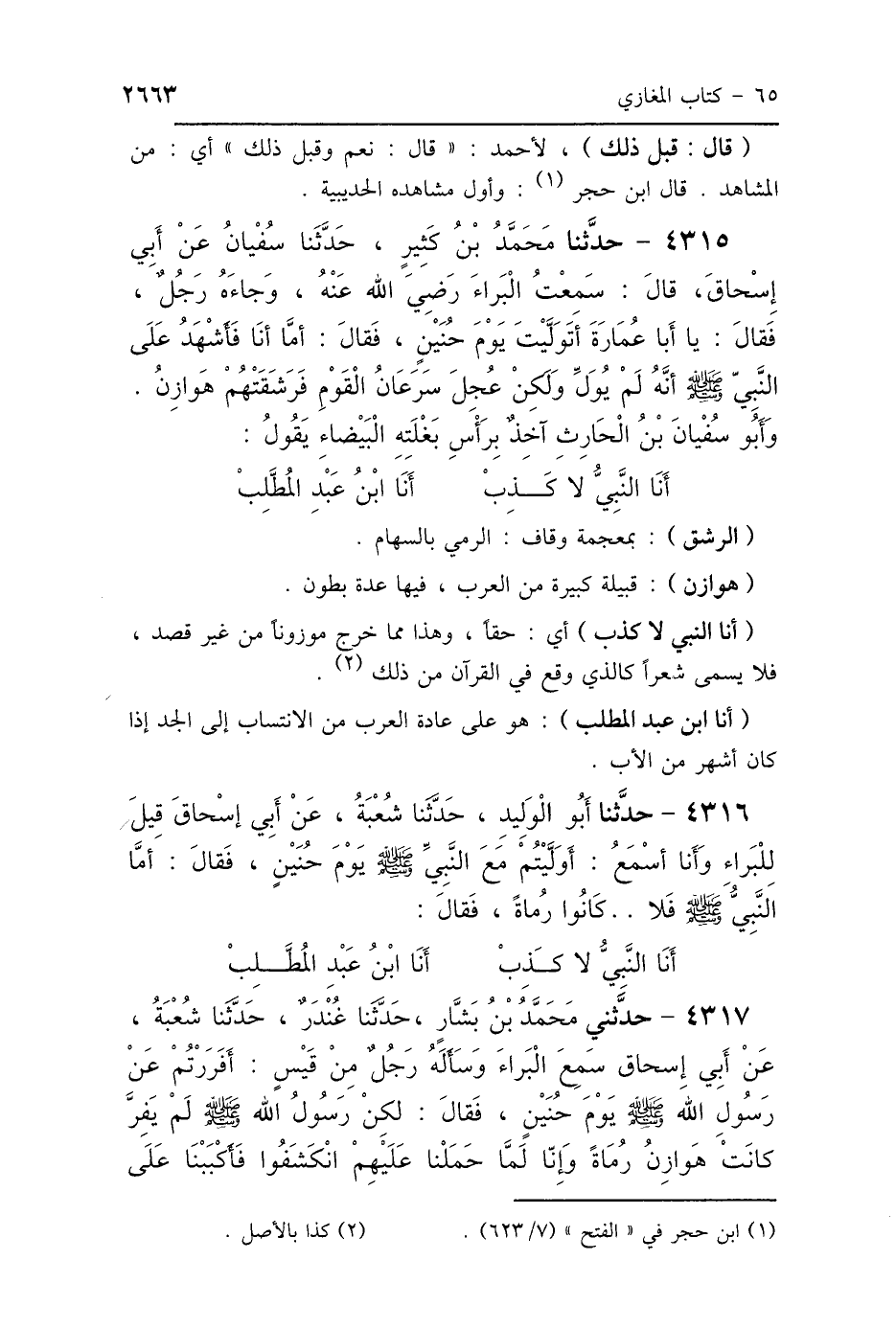 4315 - حَدَّثَنَا مُحَمَّدُ بْنُ كَثِيرٍ، حَدَّثَنَا سُفْيَانُ، عَنْ أَبِي إِسْحَاقَ، قَالَ: سَمِعْتُ البَرَاءَ رَضِيَ اللَّهُ عَنْهُ، وَجَاءَهُ رَجُلٌ، فَقَالَ: يَا أَبَا عُمَارَةَ أَتَوَلَّيْتَ يَوْمَ حُنَيْنٍ؟ فَقَالَ: أَمَّا أَنَا فَأَشْهَدُ عَلَى النَّبِيِّ صَلَّى اللهُ عَلَيْهِ وَسَلَّمَ أَنَّهُ لَمْ يُوَلِّ، وَلَكِنْ عَجِلَ سَرَعَانُ القَوْمِ، فَرَشَقَتْهُمْ هَوَازِنُ، وَأَبُو سُفْيَانَ بْنُ الحَارِثِ آخِذٌ بِرَأْسِ بَغْلَتِهِ البَيْضَاءِ، يَقُولُ: