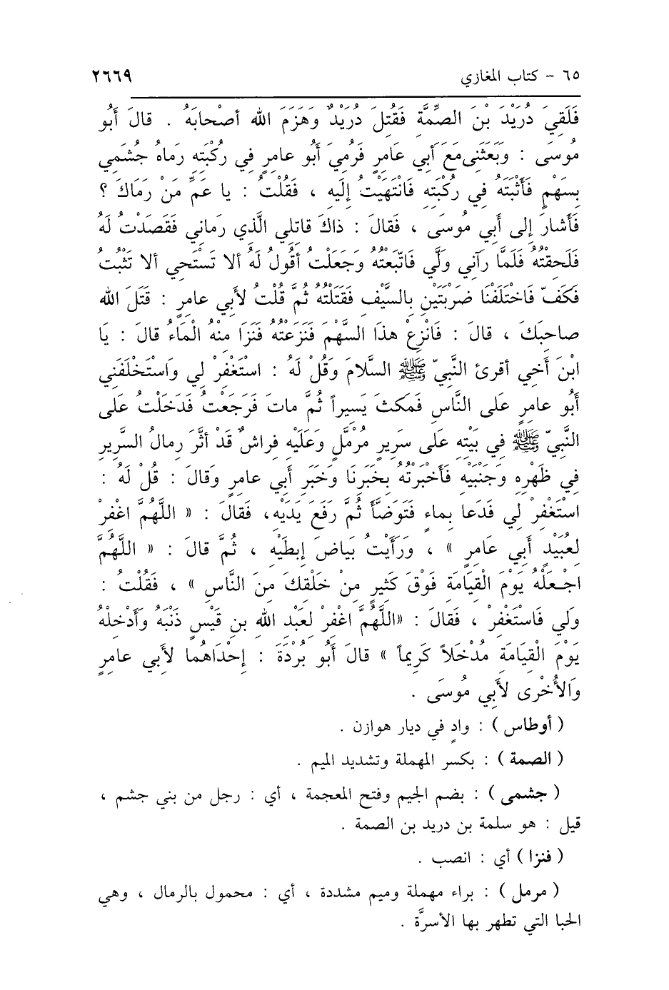 فَلَقِيَ دُرَيْدَ بْنَ الصِّمَّةِ، فَقُتِلَ دُرَيْدٌ وَهَزَمَ اللَّهُ أَصْحَابَهُ، قَالَ أَبُو مُوسَى: وَبَعَثَنِي مَعَ أَبِي عَامِرٍ، فَرُمِيَ أَبُو عَامِرٍ فِي رُكْبَتِهِ، رَمَاهُ جُشَمِيٌّ بِسَهْمٍ فَأَثْبَتَهُ فِي رُكْبَتِهِ، فَانْتَهَيْتُ إِلَيْهِ فَقُلْتُ: يَا عَمِّ مَنْ رَمَاكَ؟ فَأَشَارَ إِلَى أَبِي مُوسَى فَقَالَ: ذَاكَ قَاتِلِي الَّذِي رَمَانِي، فَقَصَدْتُ لَهُ فَلَحِقْتُهُ، فَلَمَّا رَآنِي وَلَّى، فَاتَّبَعْتُهُ وَجَعَلْتُ أَقُولُ لَهُ: أَلاَ تَسْتَحْيِي، أَلاَ تَثْبُتُ، فَكَفَّ، فَاخْتَلَفْنَا ضَرْبَتَيْنِ بِالسَّيْفِ فَقَتَلْتُهُ، ثُمَّ قُلْتُ لِأَبِي عَامِرٍ: قَتَلَ اللَّهُ صَاحِبَكَ، قَالَ: فَانْزِعْ هَذَا السَّهْمَ فَنَزَعْتُهُ فَنَزَا مِنْهُ المَاءُ، قَالَ: يَا ابْنَ أَخِي أَقْرِئِ النَّبِيَّ صَلَّى اللهُ عَلَيْهِ وَسَلَّمَ السَّلاَمَ، وَقُلْ لَهُ: اسْتَغْفِرْ لِي. وَاسْتَخْلَفَنِي أَبُو عَامِرٍ عَلَى النَّاسِ، فَمَكُثَ يَسِيرًا ثُمَّ مَاتَ، فَرَجَعْتُ فَدَخَلْتُ عَلَى النَّبِيِّ صَلَّى اللهُ عَلَيْهِ وَسَلَّمَ فِي بَيْتِهِ عَلَى سَرِيرٍ مُرْمَلٍ وَعَلَيْهِ فِرَاشٌ، قَدْ أَثَّرَ رِمَالُ السَّرِيرِ بِظَهْرِهِ وَجَنْبَيْهِ، فَأَخْبَرْتُهُ بِخَبَرِنَا وَخَبَرِ أَبِي عَامِرٍ، وَقَالَ: قُلْ لَهُ اسْتَغْفِرْ لِي، فَدَعَا بِمَاءٍ فَتَوَضَّأَ، ثُمَّ رَفَعَ يَدَيْهِ فَقَالَ: «اللَّهُمَّ اغْفِرْ لِعُبَيْدٍ أَبِي عَامِرٍ». وَرَأَيْتُ بَيَاضَ إِبْطَيْهِ، ثُمَّ قَالَ: «اللَّهُمَّ اجْعَلْهُ يَوْمَ القِيَامَةِ فَوْقَ كَثِيرٍ مِنْ خَلْقِكَ مِنَ النَّاسِ». فَقُلْتُ: وَلِي فَاسْتَغْفِرْ، فَقَالَ: «اللَّهُمَّ اغْفِرْ لِعَبْدِ اللَّهِ بْنِ قَيْسٍ ذَنْبَهُ، وَأَدْخِلْهُ يَوْمَ القِيَامَةِ مُدْخَلًا كَرِيمًا» قَالَ أَبُو بُرْدَةَ: إِحْدَاهُمَا لِأَبِي عَامِرٍ، وَالأُخْرَى لِأَبِي مُوسَى.