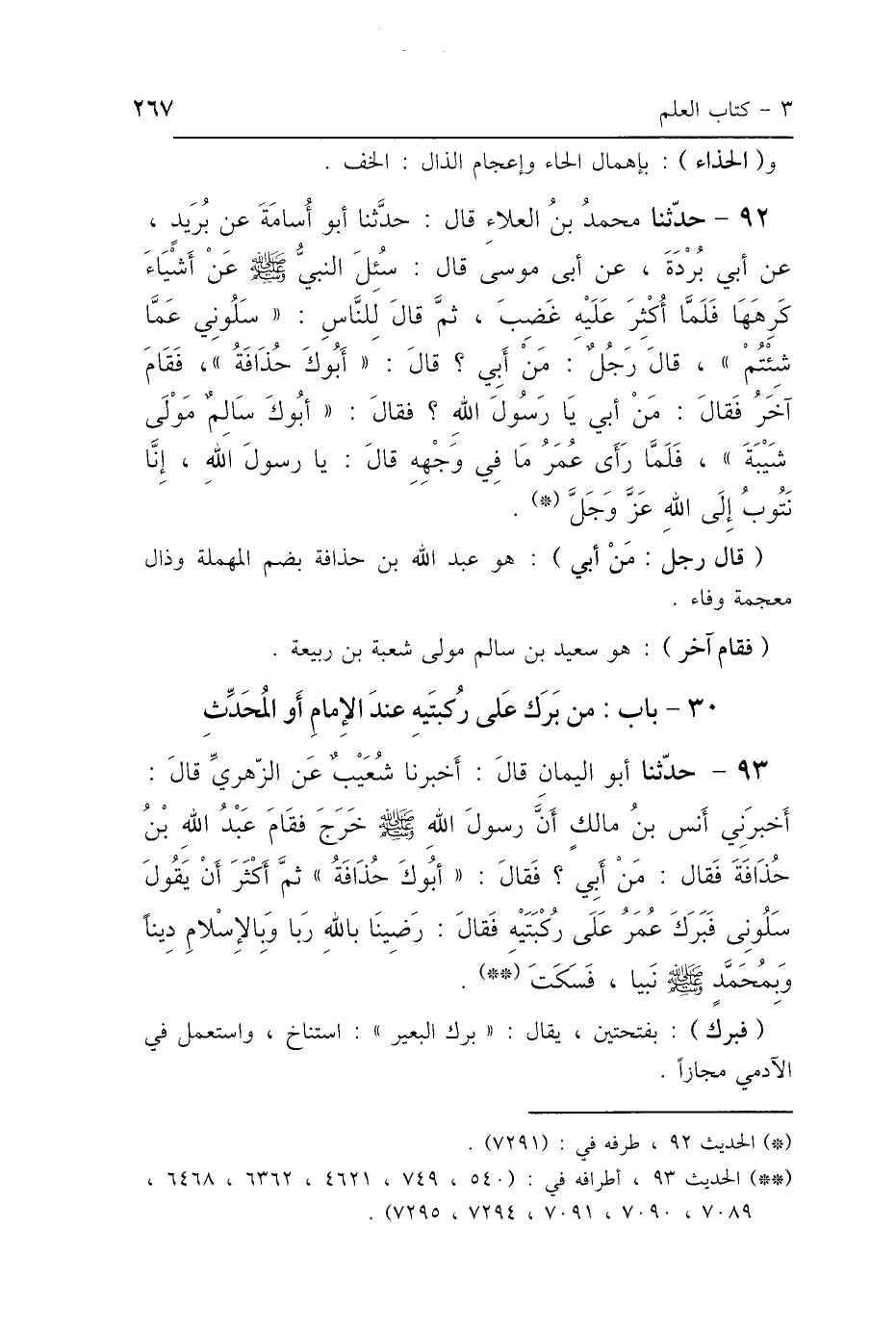 93 - حَدَّثَنَا أَبُو اليَمَانِ، قَالَ: أَخْبَرَنَا شُعَيْبٌ، عَنِ الزُّهْرِيِّ، قَالَ: أَخْبَرَنِي أَنَسُ بْنُ مَالِكٍ أَنَّ رَسُولَ اللَّهِ صَلَّى اللهُ عَلَيْهِ وَسَلَّمَ خَرَجَ، فَقَامَ عَبْدُ اللَّهِ بْنُ حُذَافَةَ فَقَالَ: مَنْ أَبِي؟ فَقَالَ: «أَبُوكَ حُذَافَةُ» ثُمَّ أَكْثَرَ أَنْ يَقُولَ: «سَلُونِي» فَبَرَكَ عُمَرُ عَلَى رُكْبَتَيْهِ فَقَالَ: رَضِينَا بِاللَّهِ رَبًّا وَبِالإِسْلاَمِ دِينًا وَبِمُحَمَّدٍ صَلَّى اللهُ عَلَيْهِ وَسَلَّمَ نَبِيًّا فَسَكَتَ.