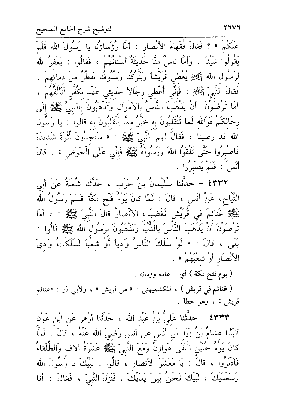 4332 - حَدَّثَنَا سُلَيْمَانُ بْنُ حَرْبٍ، حَدَّثَنَا شُعْبَةُ، عَنْ أَبِي التَّيَّاحِ، عَنْ أَنَسٍ، قَالَ: لَمَّا كَانَ يَوْمُ فَتْحِ مَكَّةَ قَسَمَ رَسُولُ اللَّهِ صَلَّى اللهُ عَلَيْهِ وَسَلَّمَ غَنَائِمَ بَيْنَ قُرَيْشٍ، فَغَضِبَتِ الأَنْصَارُ، قَالَ النَّبِيُّ صَلَّى اللهُ عَلَيْهِ وَسَلَّمَ: «أَمَا تَرْضَوْنَ أَنْ يَذْهَبَ النَّاسُ بِالدُّنْيَا، وَتَذْهَبُونَ بِرَسُولِ اللَّهِ - صَلَّى اللهُ عَلَيْهِ وَسَلَّمَ -» قَالُوا: بَلَى، قَالَ: «لَوْ سَلَكَ النَّاسُ وَادِيًا أَوْ شِعْبًا، لَسَلَكْتُ وَادِيَ الأَنْصَارِ أَوْ شِعْبَهُمْ».