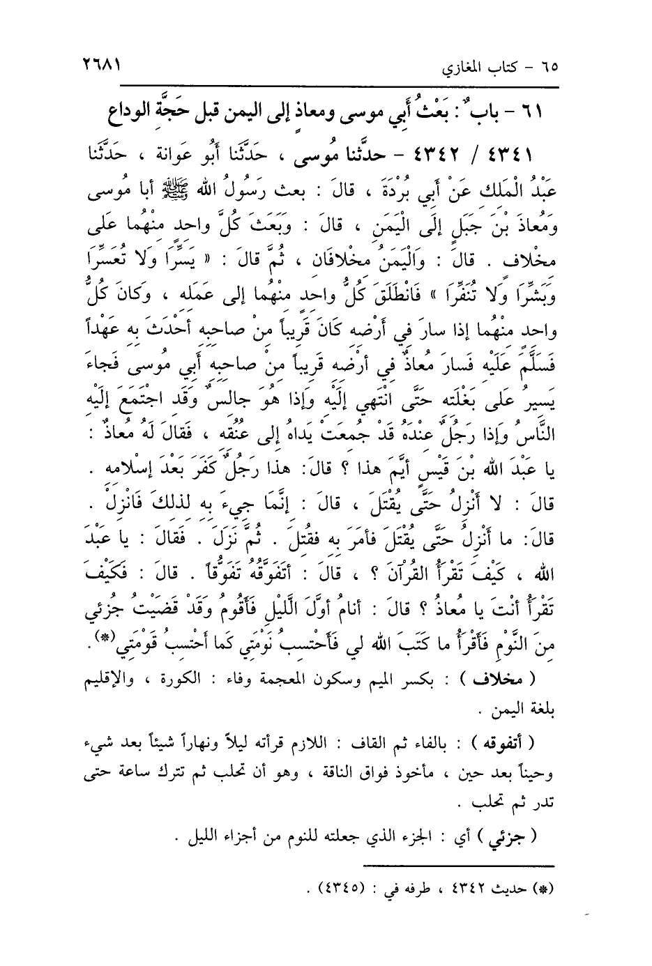 4341، 4342 - حَدَّثَنَا مُوسَى، حَدَّثَنَا أَبُو عَوَانَةَ، حَدَّثَنَا عَبْدُ المَلِكِ، عَنْ أَبِي بُرْدَةَ، قَالَ: بَعَثَ رَسُولُ اللَّهِ صَلَّى اللهُ عَلَيْهِ وَسَلَّمَ أَبَا مُوسَى، وَمُعَاذَ بْنَ جَبَلٍ إِلَى اليَمَنِ، قَالَ: وَبَعَثَ كُلَّ وَاحِدٍ مِنْهُمَا عَلَى مِخْلاَفٍ، قَالَ: وَاليَمَنُ مِخْلاَفَانِ، ثُمَّ قَالَ: «يَسِّرَا وَلاَ تُعَسِّرَا، وَبَشِّرَا وَلاَ تُنَفِّرَا»، فَانْطَلَقَ كُلُّ وَاحِدٍ مِنْهُمَا إِلَى عَمَلِهِ، وَكَانَ كُلُّ وَاحِدٍ مِنْهُمَا إِذَا سَارَ فِي أَرْضِهِ كَانَ قَرِيبًا مِنْ صَاحِبِهِ أَحْدَثَ بِهِ عَهْدًا، فَسَلَّمَ عَلَيْهِ، فَسَارَ مُعَاذٌ فِي أَرْضِهِ قَرِيبًا مِنْ صَاحِبِهِ أَبِي مُوسَى، فَجَاءَ يَسِيرُ عَلَى بَغْلَتِهِ حَتَّى انْتَهَى إِلَيْهِ، وَإِذَا هُوَ جَالِسٌ، وَقَدِ اجْتَمَعَ إِلَيْهِ النَّاسُ وَإِذَا رَجُلٌ عِنْدَهُ قَدْ جُمِعَتْ يَدَاهُ إِلَى عُنُقِهِ، فَقَالَ لَهُ مُعَاذٌ: يَا عَبْدَ اللَّهِ بْنَ قَيْسٍ أَيُّمَ هَذَا؟ قَالَ: هَذَا رَجُلٌ كَفَرَ بَعْدَ إِسْلاَمِهِ، قَالَ: لاَ أَنْزِلُ حَتَّى يُقْتَلَ، قَالَ: إِنَّمَا جِيءَ بِهِ لِذَلِكَ فَانْزِلْ، قَالَ: مَا أَنْزِلُ حَتَّى يُقْتَلَ، فَأَمَرَ بِهِ فَقُتِلَ، ثُمَّ نَزَلَ فَقَالَ: يَا عَبْدَ اللَّهِ، كَيْفَ تَقْرَأُ القُرْآنَ؟ قَالَ: أَتَفَوَّقُهُ تَفَوُّقًا، قَالَ: فَكَيْفَ تَقْرَأُ أَنْتَ يَا مُعَاذُ؟ قَالَ: أَنَامُ أَوَّلَ اللَّيْلِ، فَأَقُومُ وَقَدْ قَضَيْتُ جُزْئِي مِنَ النَّوْمِ، فَأَقْرَأُ مَا كَتَبَ اللَّهُ لِي، فَأَحْتَسِبُ نَوْمَتِي كَمَا أَحْتَسِبُ قَوْمَتِي.