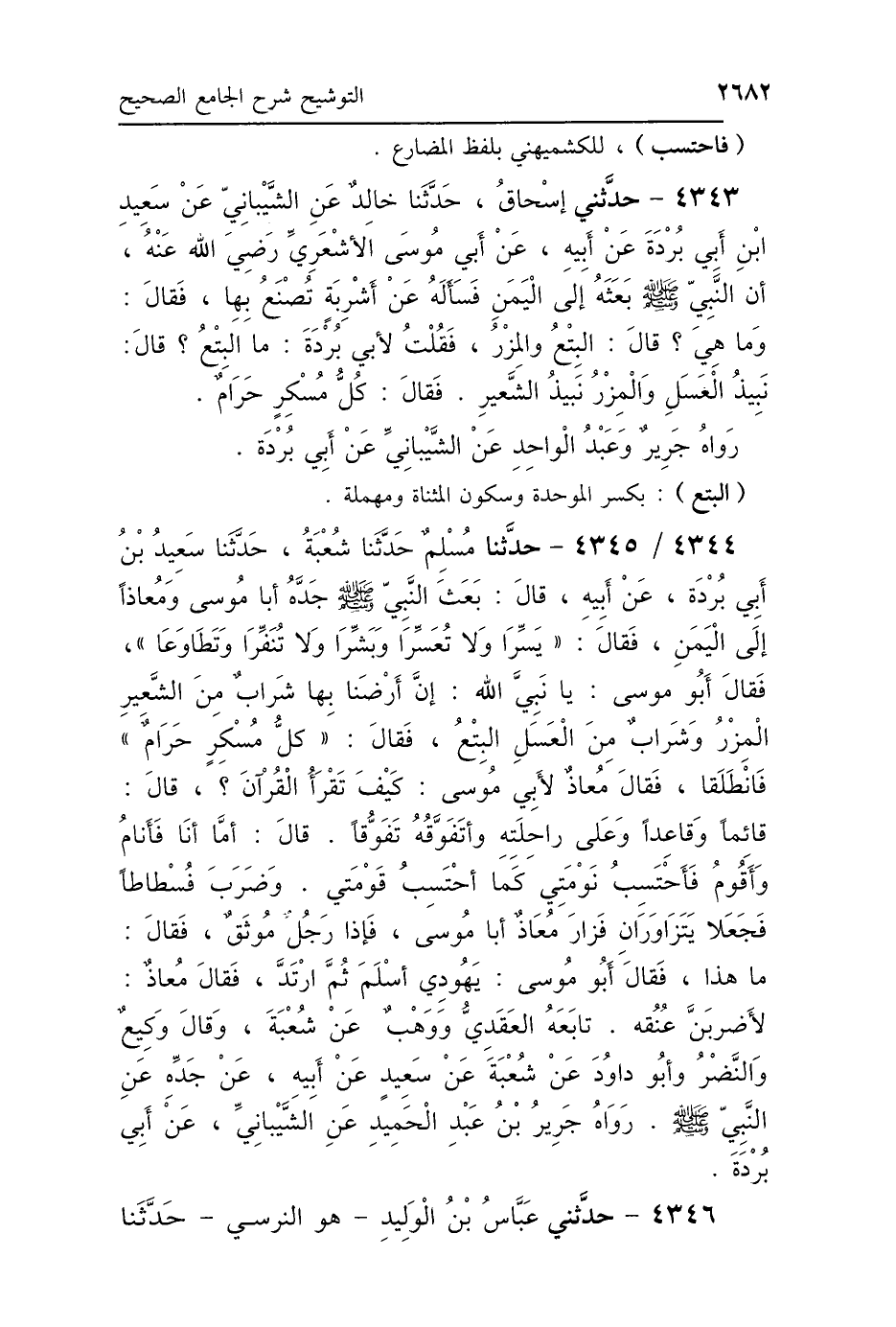 4343 - حَدَّثَنِي إِسْحَاقُ، حَدَّثَنَا خَالِدٌ، عَنِ الشَّيْبَانِيِّ، عَنْ سَعِيدِ بْنِ أَبِي بُرْدَةَ، عَنْ أَبِيهِ، عَنْ أَبِي مُوسَى الأَشْعَرِيِّ رَضِيَ اللَّهُ عَنْهُ، أَنَّ النَّبِيَّ صَلَّى اللهُ عَلَيْهِ وَسَلَّمَ بَعَثَهُ إِلَى اليَمَنِ، فَسَأَلَهُ عَنْ أَشْرِبَةٍ تُصْنَعُ بِهَا، فَقَالَ: «وَمَا هِيَ؟» قَالَ: البِتْعُ وَالمِزْرُ، فَقُلْتُ لِأَبِي بُرْدَةَ: مَا البِتْعُ؟ قَالَ: نَبِيذُ العَسَلِ، وَالمِزْرُ نَبِيذُ الشَّعِيرِ، فَقَالَ: «كُلُّ مُسْكِرٍ حَرَامٌ» رَوَاهُ جَرِيرٌ، وَعَبْدُ الوَاحِدِ، عَنِ الشَّيْبَانِيِّ، عَنْ أَبِي بُرْدَةَ.