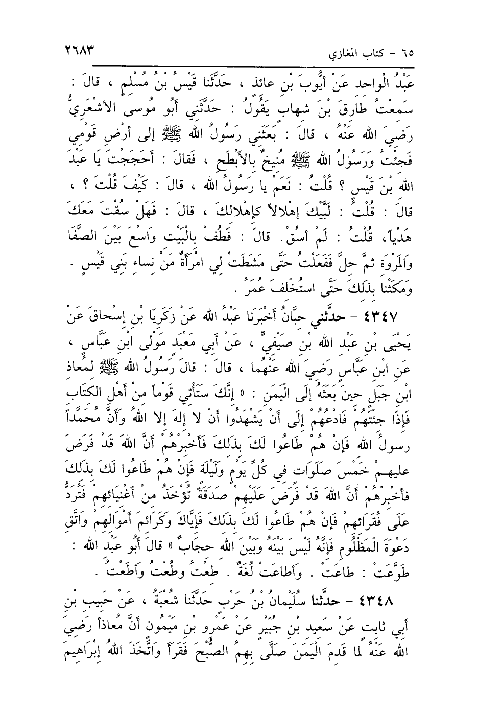 4347 - حَدَّثَنِي حِبَّانُ، أَخْبَرَنَا عَبْدُ اللَّهِ، عَنْ زَكَرِيَّاءَ بْنِ إِسْحَاقَ، عَنْ يَحْيَى بْنِ عَبْدِ اللَّهِ بْنِ صَيْفِيٍّ، عَنْ أَبِي مَعْبَدٍ، مَوْلَى ابْنِ عَبَّاسٍ، عَنِ ابْنِ عَبَّاسٍ رَضِيَ اللَّهُ عَنْهُمَا، قَالَ: قَالَ رَسُولُ اللَّهِ صَلَّى اللهُ عَلَيْهِ وَسَلَّمَ لِمُعَاذِ بْنِ جَبَلٍ حِينَ بَعَثَهُ إِلَى اليَمَنِ: «إِنَّكَ سَتَأْتِي قَوْمًا مِنْ أَهْلِ الكِتَابِ، فَإِذَا جِئْتَهُمْ فَادْعُهُمْ إِلَى أَنْ يَشْهَدُوا أَنْ لاَ إِلَهَ إِلَّا اللَّهُ، وَأَنَّ مُحَمَّدًا رَسُولُ اللَّهِ، فَإِنْ هُمْ طَاعُوا لَكَ بِذَلِكَ، فَأَخْبِرْهُمْ أَنَّ اللَّهَ قَدْ فَرَضَ عَلَيْهِمْ خَمْسَ صَلَوَاتٍ فِي كُلِّ يَوْمٍ وَلَيْلَةٍ، فَإِنْ هُمْ طَاعُوا لَكَ بِذَلِكَ فَأَخْبِرْهُمْ أَنَّ اللَّهَ قَدْ فَرَضَ عَلَيْهِمْ صَدَقَةً، تُؤْخَذُ مِنْ أَغْنِيَائِهِمْ فَتُرَدُّ عَلَى فُقَرَائِهِمْ، فَإِنْ هُمْ طَاعُوا لَكَ بِذَلِكَ فَإِيَّاكَ وَكَرَائِمَ أَمْوَالِهِمْ، وَاتَّقِ دَعْوَةَ المَظْلُومِ، فَإِنَّهُ لَيْسَ بَيْنَهُ وَبَيْنَ اللَّهِ حِجَابٌ» قَالَ أَبُو عَبْدِ اللَّهِ: طَوَّعَتْ طَاعَتْ، وَأَطَاعَتْ لُغَةٌ، طِعْتُ وَطُعْتُ وَأَطَعْتُ.