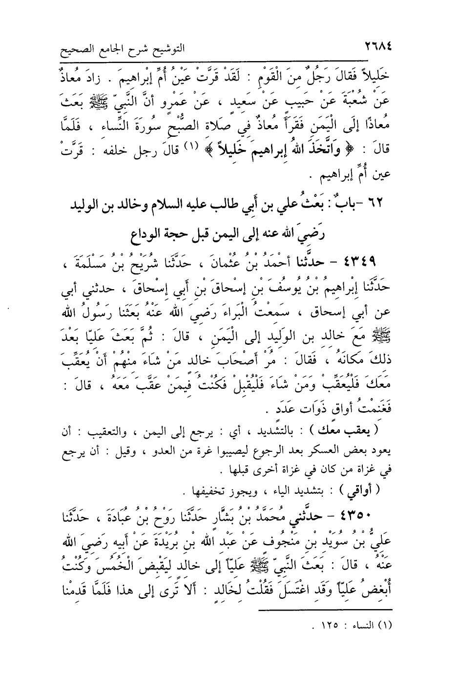 4349 - حَدَّثَنِي أَحْمَدُ بْنُ عُثْمَانَ، حَدَّثَنَا شُرَيْحُ بْنُ مَسْلَمَةَ، حَدَّثَنَا إِبْرَاهِيمُ بْنُ يُوسُفَ بْنِ إِسْحَاقَ بْنِ أَبِي إِسْحَاقَ، حَدَّثَنِي أَبِي، عَنْ أَبِي إِسْحَاقَ، سَمِعْتُ البَرَاءَ رَضِيَ اللَّهُ عَنْهُ، بَعَثَنَا رَسُولُ اللَّهِ صَلَّى اللهُ عَلَيْهِ وَسَلَّمَ مَعَ خَالِدِ بْنِ الوَلِيدِ إِلَى اليَمَنِ، قَالَ: ثُمَّ بَعَثَ عَلِيًّا بَعْدَ ذَلِكَ مَكَانَهُ فَقَالَ: «مُرْ أَصْحَابَ خَالِدٍ، مَنْ شَاءَ مِنْهُمْ أَنْ يُعَقِّبَ مَعَكَ فَلْيُعَقِّبْ، وَمَنْ شَاءَ فَلْيُقْبِلْ» فَكُنْتُ فِيمَنْ عَقَّبَ مَعَهُ، قَالَ: فَغَنِمْتُ أَوَاقٍ ذَوَاتِ عَدَدٍ.