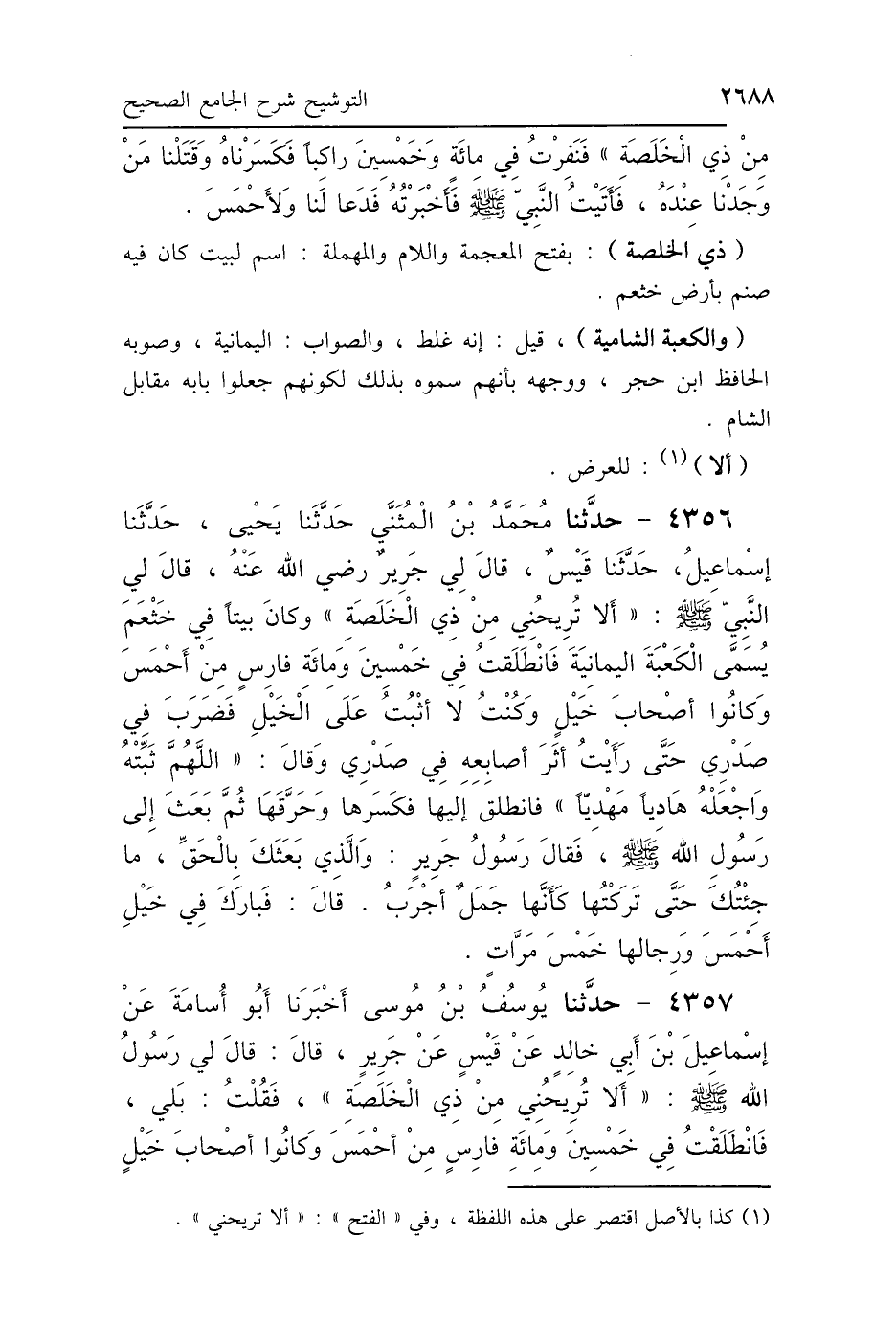 4357 - حَدَّثَنَا يُوسُفُ بْنُ مُوسَى، أَخْبَرَنَا أَبُو أُسَامَةَ، عَنْ إِسْمَاعِيلَ بْنِ أَبِي خَالِدٍ، عَنْ قَيْسٍ، عَنْ جَرِيرٍ، قَالَ: قَالَ لِي رَسُولُ اللَّهِ صَلَّى اللهُ عَلَيْهِ وَسَلَّمَ: «أَلاَ تُرِيحُنِي مِنْ ذِي الخَلَصَةِ» فَقُلْتُ: بَلَى، فَانْطَلَقْتُ فِي خَمْسِينَ وَمِائَةِ فَارِسٍ مِنْ أَحْمَسَ، وَكَانُوا أَصْحَابَ خَيْلٍ،