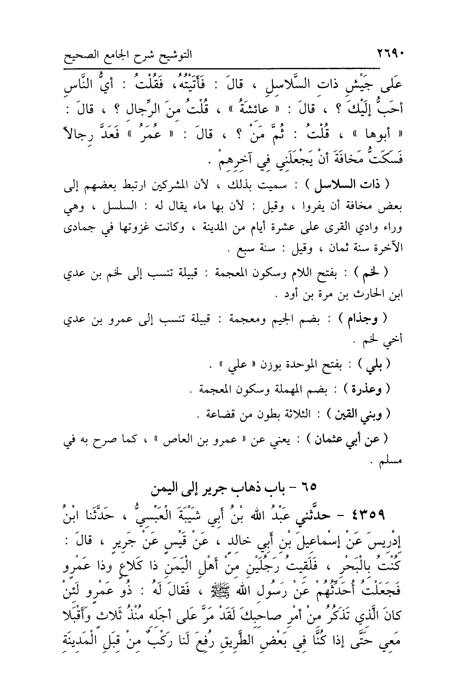 عَلَى جَيْشِ ذَاتِ السُّلاَسِلِ، قَالَ: فَأَتَيْتُهُ فَقُلْتُ: أَيُّ النَّاسِ أَحَبُّ إِلَيْكَ؟ قَالَ: «عَائِشَةُ» قُلْتُ: مِنَ الرِّجَالِ؟ قَالَ: «أَبُوهَا» قُلْتُ: ثُمَّ مَنْ؟ قَالَ: «عُمَرُ» فَعَدَّ رِجَالًا، فَسَكَتُّ مَخَافَةَ أَنْ يَجْعَلَنِي فِي آخِرِهِمْ.