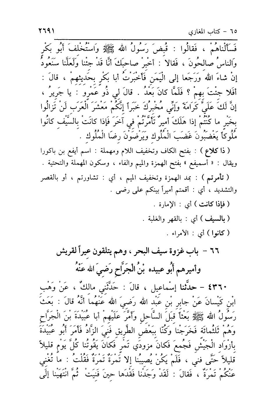 فَسَأَلْنَاهُمْ، فَقَالُوا: " قُبِضَ رَسُولُ اللَّهِ صَلَّى اللهُ عَلَيْهِ وَسَلَّمَ، وَاسْتُخْلِفَ أَبُو بَكْرٍ، وَالنَّاسُ صَالِحُونَ، فَقَالاَ: أَخْبِرْ صَاحِبَكَ أَنَّا قَدْ جِئْنَا وَلَعَلَّنَا سَنَعُودُ إِنْ شَاءَ اللَّهُ، وَرَجَعَا إِلَى اليَمَنِ، فَأَخْبَرْتُ أَبَا بَكْرٍ بِحَدِيثِهِمْ، قَالَ: أَفَلاَ جِئْتَ بِهِمْ، فَلَمَّا كَانَ بَعْدُ قَالَ لِي ذُو عَمْرٍو: يَا جَرِيرُ إِنَّ بِكَ عَلَيَّ كَرَامَةً، وَإِنِّي مُخْبِرُكَ خَبَرًا: إِنَّكُمْ مَعْشَرَ العَرَبِ، لَنْ تَزَالُوا بِخَيْرٍ مَا كُنْتُمْ إِذَا هَلَكَ أَمِيرٌ تَأَمَّرْتُمْ فِي آخَرَ، فَإِذَا كَانَتْ بِالسَّيْفِ كَانُوا مُلُوكًا، يَغْضَبُونَ غَضَبَ المُلُوكِ وَيَرْضَوْنَ رِضَا المُلُوكِ".