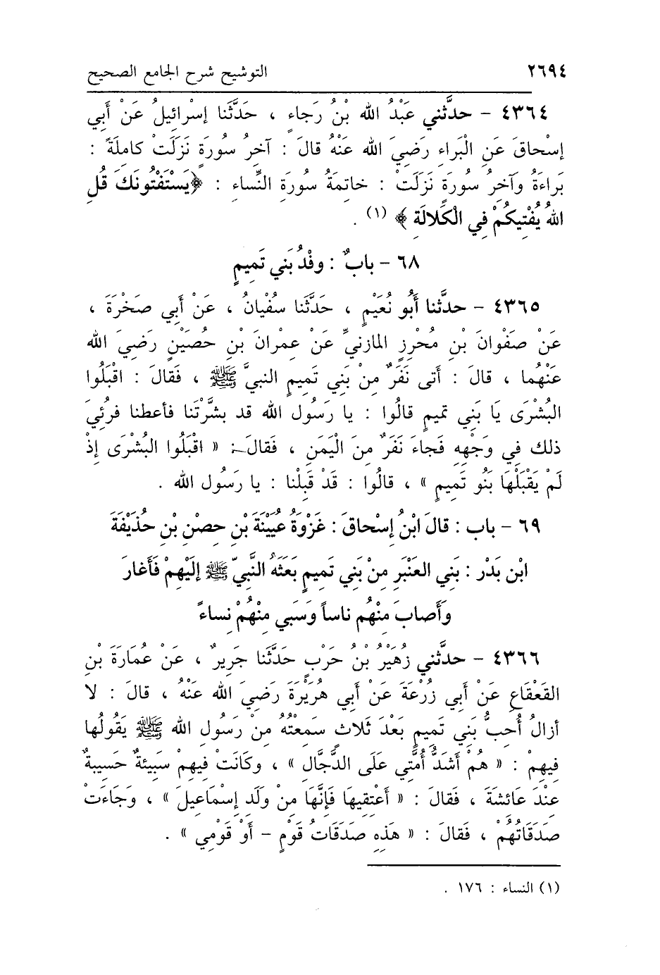 4365 - حَدَّثَنَا أَبُو نُعَيْمٍ، حَدَّثَنَا سُفْيَانُ، عَنْ أَبِي صَخْرَةَ، عَنْ صَفْوَانَ بْنِ مُحْرِزٍ المَازِنِيِّ، عَنْ عِمْرَانَ بْنِ حُصَيْنٍ رَضِيَ اللَّهُ عَنْهُمَا، قَالَ: أَتَى نَفَرٌ مِنْ بَنِي تَمِيمٍ النَّبِيَّ صَلَّى اللهُ عَلَيْهِ وَسَلَّمَ، فَقَالَ: «اقْبَلُوا البُشْرَى يَا بَنِي تَمِيمٍ». قَالُوا: يَا رَسُولَ اللَّهِ قَدْ بَشَّرْتَنَا فَأَعْطِنَا، فَرُئِيَ ذَلِكَ فِي وَجْهِهِ، فَجَاءَ نَفَرٌ مِنَ اليَمَنِ، فَقَالَ: «اقْبَلُوا البُشْرَى إِذْ لَمْ يَقْبَلْهَا بَنُو تَمِيمٍ» قَالُوا: قَدْ قَبِلْنَا يَا رَسُولَ اللَّهِ.