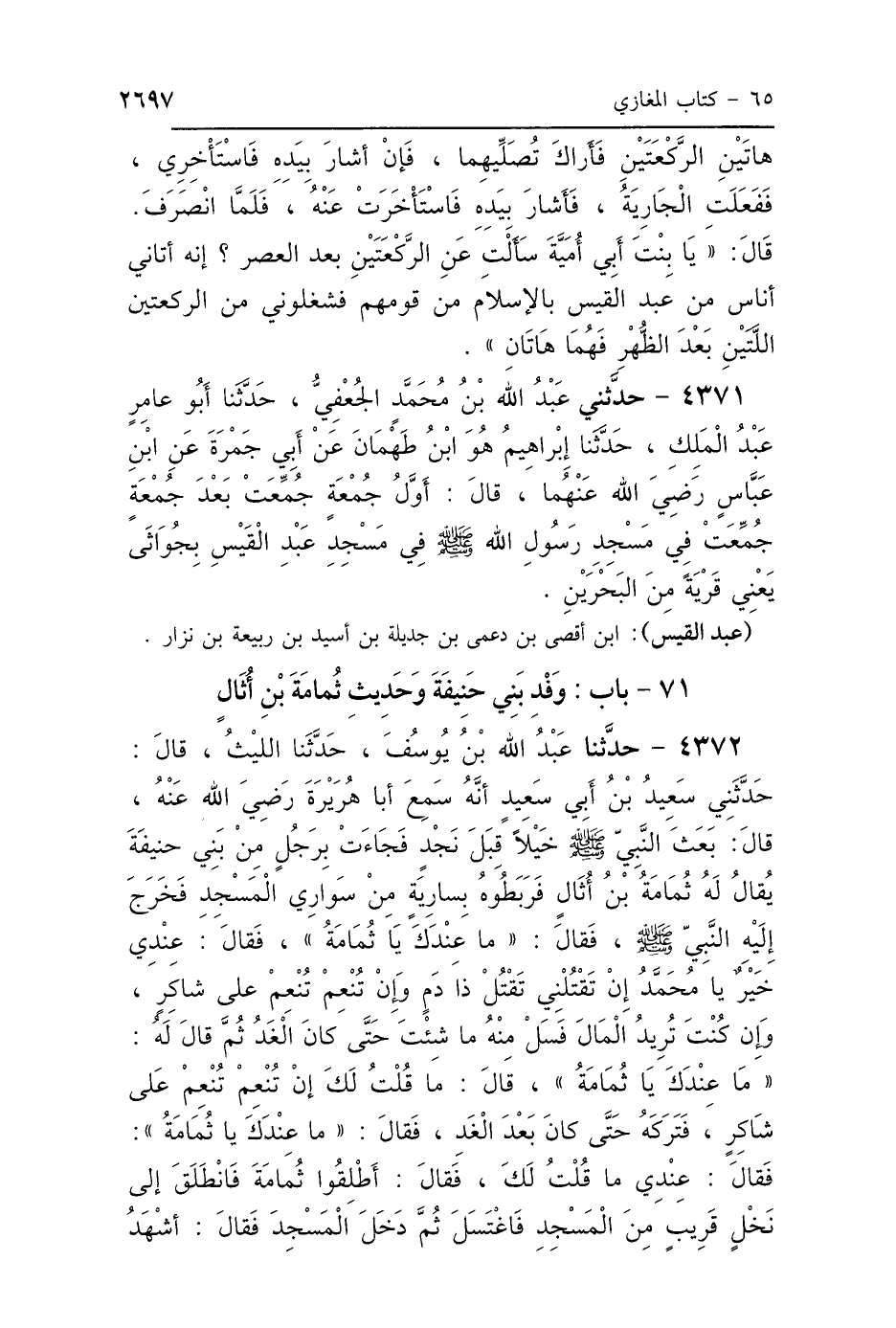 4372 - حَدَّثَنَا عَبْدُ اللَّهِ بْنُ يُوسُفَ، حَدَّثَنَا اللَّيْثُ، قَالَ: حَدَّثَنِي سَعِيدُ بْنُ أَبِي سَعِيدٍ، أَنَّهُ سَمِعَ أَبَا هُرَيْرَةَ رَضِيَ اللَّهُ عَنْهُ، قَالَ: بَعَثَ النَّبِيُّ صَلَّى اللهُ عَلَيْهِ وَسَلَّمَ خَيْلًا قِبَلَ نَجْدٍ، فَجَاءَتْ بِرَجُلٍ مِنْ بَنِي حَنِيفَةَ يُقَالُ لَهُ ثُمَامَةُ بْنُ أُثَالٍ، فَرَبَطُوهُ بِسَارِيَةٍ مِنْ سَوَارِي المَسْجِدِ، فَخَرَجَ إِلَيْهِ النَّبِيُّ صَلَّى اللهُ عَلَيْهِ وَسَلَّمَ، فَقَالَ: «مَا عِنْدَكَ يَا ثُمَامَةُ؟» فَقَالَ: عِنْدِي خَيْرٌ يَا مُحَمَّدُ، إِنْ تَقْتُلْنِي تَقْتُلْ ذَا دَمٍ، وَإِنْ تُنْعِمْ تُنْعِمْ عَلَى شَاكِرٍ، وَإِنْ كُنْتَ تُرِيدُ المَالَ فَسَلْ مِنْهُ مَا شِئْتَ، فَتُرِكَ حَتَّى كَانَ الغَدُ، ثُمَّ قَالَ لَهُ: «مَا عِنْدَكَ يَا ثُمَامَةُ؟» قَالَ: مَا قُلْتُ لَكَ: إِنْ تُنْعِمْ تُنْعِمْ عَلَى شَاكِرٍ، فَتَرَكَهُ حَتَّى كَانَ بَعْدَ الغَدِ، فَقَالَ: «مَا عِنْدَكَ يَا ثُمَامَةُ؟» فَقَالَ: عِنْدِي مَا قُلْتُ لَكَ، فَقَالَ: «أَطْلِقُوا ثُمَامَةَ» فَانْطَلَقَ إِلَى نَجْلٍ قَرِيبٍ مِنَ المَسْجِدِ، فَاغْتَسَلَ ثُمَّ دَخَلَ المَسْجِدَ، فَقَالَ: أَشْهَدُ