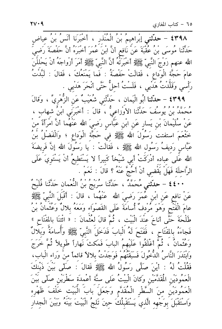 4400 - حَدَّثَنِي مُحَمَّدٌ، حَدَّثَنَا سُرَيْجُ بْنُ النُّعْمَانِ، حَدَّثَنَا فُلَيْحٌ، عَنْ نَافِعٍ، عَنِ ابْنِ عُمَرَ رَضِيَ اللَّهُ عَنْهُمَا، قَالَ: أَقْبَلَ النَّبِيُّ صَلَّى اللهُ عَلَيْهِ وَسَلَّمَ عَامَ الفَتْحِ، وَهُوَ مُرْدِفٌ أُسَامَةَ عَلَى القَصْوَاءِ، وَمَعَهُ بِلاَلٌ، وَعُثْمَانُ بْنُ طَلْحَةَ، حَتَّى أَنَاخَ عِنْدَ البَيْتِ، ثُمَّ قَالَ لِعُثْمَانَ: «ائْتِنَا بِالْمِفْتَاحِ». فَجَاءَهُ بِالْمِفْتَاحِ فَفَتَحَ لَهُ البَابَ، فَدَخَلَ النَّبِيُّ صَلَّى اللهُ عَلَيْهِ وَسَلَّمَ وَأُسَامَةُ، وَبِلاَلٌ، وَعُثْمَانُ، ثُمَّ أَغْلَقُوا عَلَيْهِمُ البَابَ، فَمَكَثَ نَهَارًا طَوِيلًا، ثُمَّ خَرَجَ وَابْتَدَرَ النَّاسُ الدُّخُولَ، فَسَبَقْتُهُمْ فَوَجَدْتُ بِلاَلًا قَائِمًا مِنْ وَرَاءِ البَابِ، فَقُلْتُ لَهُ: أَيْنَ صَلَّى رَسُولُ اللَّهِ صَلَّى اللهُ عَلَيْهِ وَسَلَّمَ؟ فَقَالَ: صَلَّى بَيْنَ ذَيْنِكَ العَمُودَيْنِ المُقَدَّمَيْنِ، وَكَانَ البَيْتُ عَلَى سِتَّةِ أَعْمِدَةٍ سَطْرَيْنِ، صَلَّى بَيْنَ العَمُودَيْنِ مِنَ السَّطْرِ المُقَدَّمِ، وَجَعَلَ بَابَ البَيْتِ خَلْفَ ظَهْرِهِ، وَاسْتَقْبَلَ بِوَجْهِهِ الَّذِي يَسْتَقْبِلُكَ حِينَ تَلِجُ البَيْتَ بَيْنَهُ وَبَيْنَ الجِدَارِ،