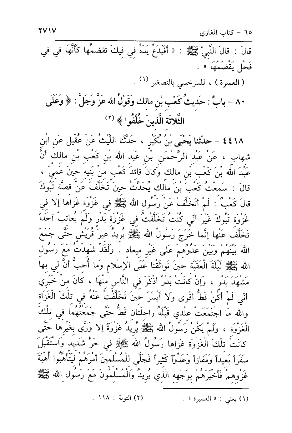 4418 - حَدَّثَنَا يَحْيَى بْنُ بُكَيْرٍ، حَدَّثَنَا اللَّيْثُ، عَنْ عُقَيْلٍ، عَنِ ابْنِ شِهَابٍ، عَنْ عَبْدِ الرَّحْمَنِ بْنِ عَبْدِ اللَّهِ بْنِ كَعْبِ بْنِ مَالِكٍ، أَنَّ عَبْدَ اللَّهِ بْنَ كَعْبِ بْنِ مَالِكٍ، وَكَانَ، قَائِدَ كَعْبٍ مِنْ بَنِيهِ، حِينَ عَمِيَ، قَالَ: سَمِعْتُ كَعْبَ بْنَ مَالِكٍ، يُحَدِّثُ حِينَ تَخَلَّفَ عَنْ قِصَّةِ، تَبُوكَ، قَالَ كَعْبٌ: لَمْ أَتَخَلَّفْ عَنْ رَسُولِ اللَّهِ صَلَّى اللهُ عَلَيْهِ وَسَلَّمَ فِي غَزْوَةٍ غَزَاهَا إِلَّا فِي غَزْوَةِ تَبُوكَ، غَيْرَ أَنِّي كُنْتُ تَخَلَّفْتُ فِي غَزْوَةِ بَدْرٍ، وَلَمْ يُعَاتِبْ أَحَدًا تَخَلَّفَ عَنْهَا، إِنَّمَا خَرَجَ رَسُولُ اللَّهِ صَلَّى اللهُ عَلَيْهِ وَسَلَّمَ يُرِيدُ عِيرَ قُرَيْشٍ، حَتَّى جَمَعَ اللَّهُ بَيْنَهُمْ وَبَيْنَ عَدُوِّهِمْ عَلَى غَيْرِ مِيعَادٍ، وَلَقَدْ شَهِدْتُ مَعَ رَسُولِ اللَّهِ صَلَّى اللهُ عَلَيْهِ وَسَلَّمَ لَيْلَةَ العَقَبَةِ، حِينَ تَوَاثَقْنَا عَلَى الإِسْلاَمِ، وَمَا أُحِبُّ أَنَّ لِي بِهَا مَشْهَدَ بَدْرٍ، وَإِنْ كَانَتْ بَدْرٌ، أَذْكَرَ فِي النَّاسِ مِنْهَا، كَانَ مِنْ خَبَرِي: أَنِّي لَمْ أَكُنْ قَطُّ أَقْوَى وَلاَ أَيْسَرَ حِينَ تَخَلَّفْتُ عَنْهُ، فِي تِلْكَ الغَزَاةِ، وَاللَّهِ مَا اجْتَمَعَتْ عِنْدِي قَبْلَهُ رَاحِلَتَانِ قَطُّ، حَتَّى جَمَعْتُهُمَا فِي تِلْكَ الغَزْوَةِ، وَلَمْ يَكُنْ رَسُولُ اللَّهِ صَلَّى اللهُ عَلَيْهِ وَسَلَّمَ يُرِيدُ غَزْوَةً إِلَّا وَرَّى بِغَيْرِهَا، حَتَّى كَانَتْ تِلْكَ الغَزْوَةُ، غَزَاهَا رَسُولُ اللَّهِ صَلَّى اللهُ عَلَيْهِ وَسَلَّمَ فِي حَرٍّ شَدِيدٍ، وَاسْتَقْبَلَ سَفَرًا بَعِيدًا، وَمَفَازًا وَعَدُوًّا كَثِيرًا، فَجَلَّى لِلْمُسْلِمِينَ أَمْرَهُمْ لِيَتَأَهَّبُوا أُهْبَةَ غَزْوِهِمْ، فَأَخْبَرَهُمْ بِوَجْهِهِ الَّذِي يُرِيدُ، وَالمُسْلِمُونَ مَعَ رَسُولِ اللَّهِ صَلَّى اللهُ عَلَيْهِ وَسَلَّمَ