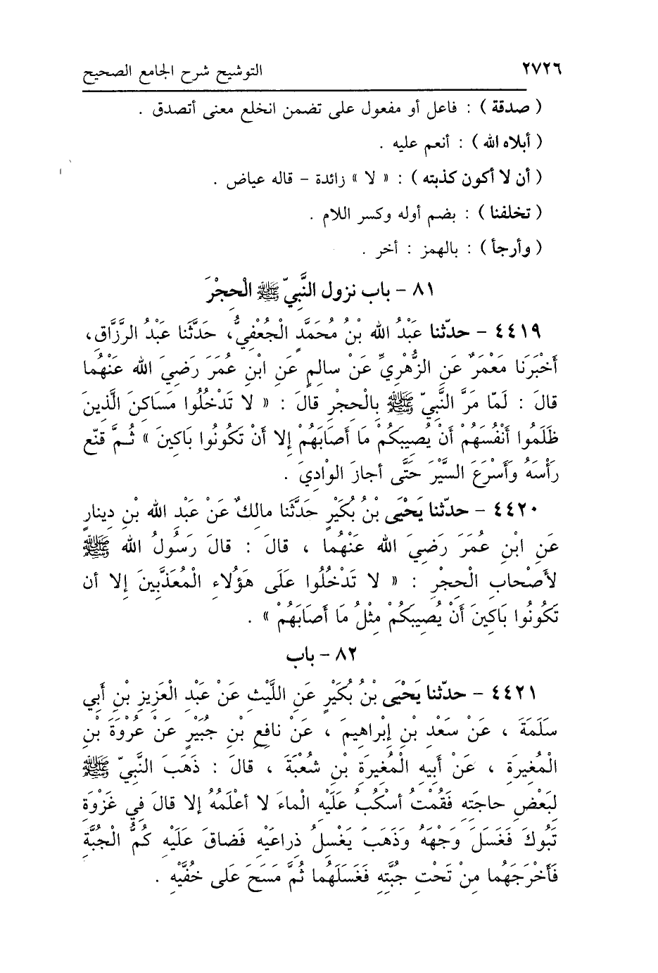 4419 - حَدَّثَنَا عَبْدُ اللَّهِ بْنُ مُحَمَّدٍ الجُعْفِيُّ، حَدَّثَنَا عَبْدُ الرَّزَّاقِ، أَخْبَرَنَا مَعْمَرٌ، عَنِ الزُّهْرِيِّ، عَنْ سَالِمٍ، عَنِ ابْنِ عُمَرَ رَضِيَ اللَّهُ عَنْهُمَا، قَالَ: لَمَّا مَرَّ النَّبِيُّ صَلَّى اللهُ عَلَيْهِ وَسَلَّمَ بِالحِجْرِ قَالَ: «لاَ تَدْخُلُوا مَسَاكِنَ الَّذِينَ ظَلَمُوا أَنْفُسَهُمْ، أَنْ يُصِيبَكُمْ مَا أَصَابَهُمْ، إِلَّا أَنْ تَكُونُوا بَاكِينَ، ثُمَّ قَنَّعَ رَأْسَهُ وَأَسْرَعَ السَّيْرَ حَتَّى أَجَازَ الوَادِيَ».