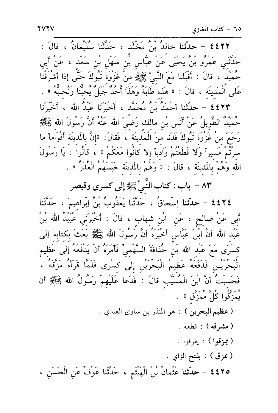 4424 - حَدَّثَنَا إِسْحَاقُ، حَدَّثَنَا يَعْقُوبُ بْنُ إِبْرَاهِيمَ، حَدَّثَنَا أَبِي، عَنْ صَالِحٍ، عَنِ ابْنِ شِهَابٍ، قَالَ: أَخْبَرَنِي عُبَيْدُ اللَّهِ بْنُ عَبْدِ اللَّهِ، أَنَّ ابْنَ عَبَّاسٍ، أَخْبَرَهُ " أَنَّ رَسُولَ اللَّهِ صَلَّى اللهُ عَلَيْهِ وَسَلَّمَ: بَعَثَ بِكِتَابِهِ إِلَى كِسْرَى، مَعَ عَبْدِ اللَّهِ بْنِ حُذَافَةَ السَّهْمِيِّ " فَأَمَرَهُ أَنْ يَدْفَعَهُ إِلَى عَظِيمِ البَحْرَيْنِ، فَدَفَعَهُ عَظِيمُ البَحْرَيْنِ إِلَى كِسْرَى، فَلَمَّا قَرَأَهُ مَزَّقَهُ، فَحَسِبْتُ أَنَّ ابْنَ المُسَيِّبِ، قَالَ: «فَدَعَا عَلَيْهِمْ رَسُولُ اللَّهِ صَلَّى اللهُ عَلَيْهِ وَسَلَّمَ أَنْ يُمَزَّقُوا كُلَّ مُمَزَّقٍ».