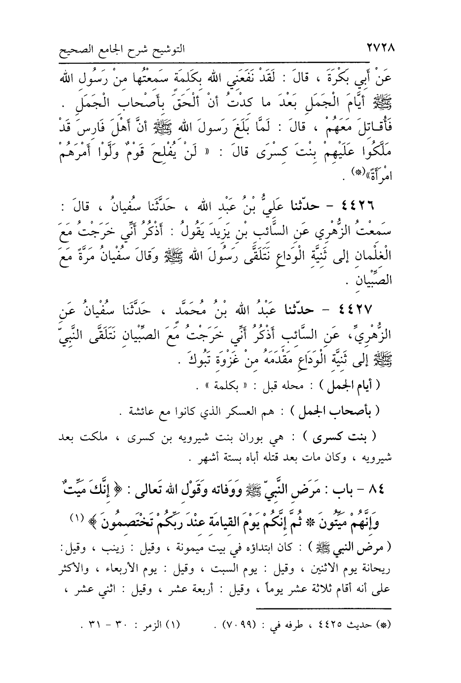 84 - بَابُ مَرَضِ النَّبِيِّ صَلَّى اللهُ عَلَيْهِ وَسَلَّمَ وَوَفَاتِهِ وَقَوْلِ اللَّهِ تَعَالَى: {إِنَّكَ مَيِّتٌ وَإِنَّهُمْ مَيِّتُونَ. ثُمَّ إِنَّكُمْ يَوْمَ القِيَامَةِ عِنْدَ رَبِّكُمْ تَخْتَصِمُونَ} [الزمر: 31]