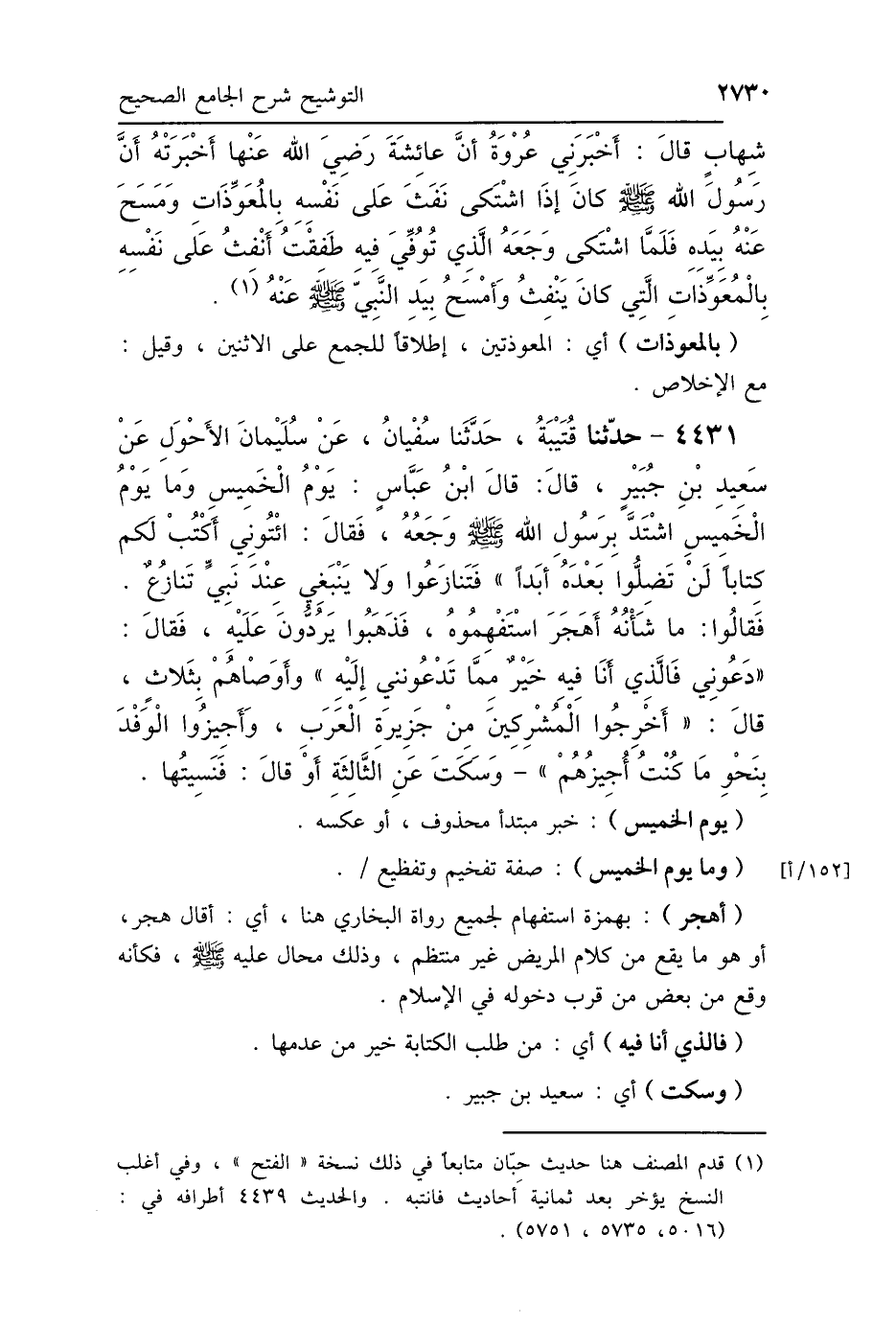 4431 - حَدَّثَنَا قُتَيْبَةُ، حَدَّثَنَا سُفْيَانُ، عَنْ سُلَيْمَانَ الأَحْوَلِ، عَنْ سَعِيدِ بْنِ جُبَيْرٍ، قَالَ: قَالَ ابْنُ عَبَّاسٍ: يَوْمُ الخَمِيسِ، وَمَا يَوْمُ الخَمِيسِ؟ اشْتَدَّ بِرَسُولِ اللَّهِ صَلَّى اللهُ عَلَيْهِ وَسَلَّمَ وَجَعُهُ، فَقَالَ: «ائْتُونِي أَكْتُبْ لَكُمْ كِتَابًا لَنْ تَضِلُّوا بَعْدَهُ أَبَدًا»، فَتَنَازَعُوا وَلاَ يَنْبَغِي عِنْدَ نَبِيٍّ تَنَازُعٌ، فَقَالُوا: مَا شَأْنُهُ، أَهَجَرَ اسْتَفْهِمُوهُ؟ فَذَهَبُوا يَرُدُّونَ عَلَيْهِ، فَقَالَ: «دَعُونِي، فَالَّذِي أَنَا فِيهِ خَيْرٌ مِمَّا تَدْعُونِي إِلَيْهِ» وَأَوْصَاهُمْ بِثَلاَثٍ، قَالَ: «أَخْرِجُوا المُشْرِكِينَ مِنْ جَزِيرَةِ العَرَبِ، وَأَجِيزُوا الوَفْدَ بِنَحْوِ مَا كُنْتُ أُجِيزُهُمْ» وَسَكَتَ عَنِ الثَّالِثَةِ أَوْ قَالَ فَنَسِيتُهَا".
