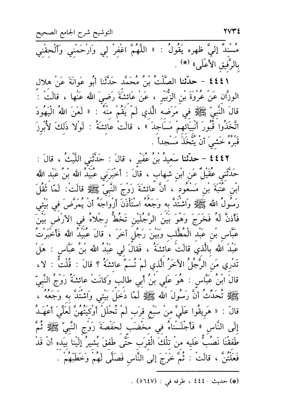 4442 - حَدَّثَنَا سَعِيدُ بْنُ عُفَيْرٍ، قَالَ: حَدَّثَنِي اللَّيْثُ، قَالَ: حَدَّثَنِي عُقَيْلٌ، عَنِ ابْنِ شِهَابٍ، قَالَ: أَخْبَرَنِي عُبَيْدُ اللَّهِ بْنُ عَبْدِ اللَّهِ بْنِ عُتْبَةَ بْنِ مَسْعُودٍ، أَنَّ عَائِشَةَ زَوْجَ النَّبِيِّ صَلَّى اللهُ عَلَيْهِ وَسَلَّمَ، قَالَتْ: لَمَّا ثَقُلَ رَسُولُ اللَّهِ صَلَّى اللهُ عَلَيْهِ وَسَلَّمَ وَاشْتَدَّ بِهِ وَجَعُهُ، اسْتَأْذَنَ أَزْوَاجَهُ أَنْ يُمَرَّضَ فِي بَيْتِي، فَأَذِنَّ لَهُ، فَخَرَجَ وَهُوَ بَيْنَ الرَّجُلَيْنِ تَخُطُّ رِجْلاَهُ فِي الأَرْضِ، بَيْنَ عَبَّاسِ بْنِ عَبْدِ المُطَّلِبِ وَبَيْنَ رَجُلٍ آخَرَ، قَالَ عُبَيْدُ اللَّهِ فَأَخْبَرْتُ عَبْدَ اللَّهِ بِالَّذِي قَالَتْ عَائِشَةُ: فَقَالَ لِي عَبْدُ اللَّهِ بْنُ عَبَّاسٍ: «هَلْ تَدْرِي مَنِ الرَّجُلُ الآخَرُ الَّذِي لَمْ تُسَمِّ عَائِشَةُ؟» قَالَ: قُلْتُ: لاَ، قَالَ ابْنُ عَبَّاسٍ: «هُوَ عَلِيُّ بْنُ أَبِي طَالِبٍ» وَكَانَتْ عَائِشَةُ زَوْجُ النَّبِيِّ صَلَّى اللهُ عَلَيْهِ وَسَلَّمَ تُحَدِّثُ أَنَّ رَسُولَ اللَّهِ صَلَّى اللهُ عَلَيْهِ وَسَلَّمَ لَمَّا دَخَلَ بَيْتِي وَاشْتَدَّ بِهِ وَجَعُهُ قَالَ: «هَرِيقُوا عَلَيَّ مِنْ سَبْعِ قِرَبٍ، لَمْ تُحْلَلْ، أَوْكِيَتُهُنَّ لَعَلِّي أَعْهَدُ إِلَى النَّاسِ» فَأَجْلَسْنَاهُ فِي مِخْضَبٍ لِحَفْصَةَ زَوْجِ النَّبِيِّ صَلَّى اللهُ عَلَيْهِ وَسَلَّمَ، ثُمَّ طَفِقْنَا نَصُبُّ عَلَيْهِ مِنْ تِلْكَ القِرَبِ، حَتَّى طَفِقَ يُشِيرُ إِلَيْنَا بِيَدِهِ، «أَنْ قَدْ فَعَلْتُنَّ» قَالَتْ: ثُمَّ خَرَجَ إِلَى النَّاسِ فَصَلَّى بِهِمْ وَخَطَبَهُمْ.