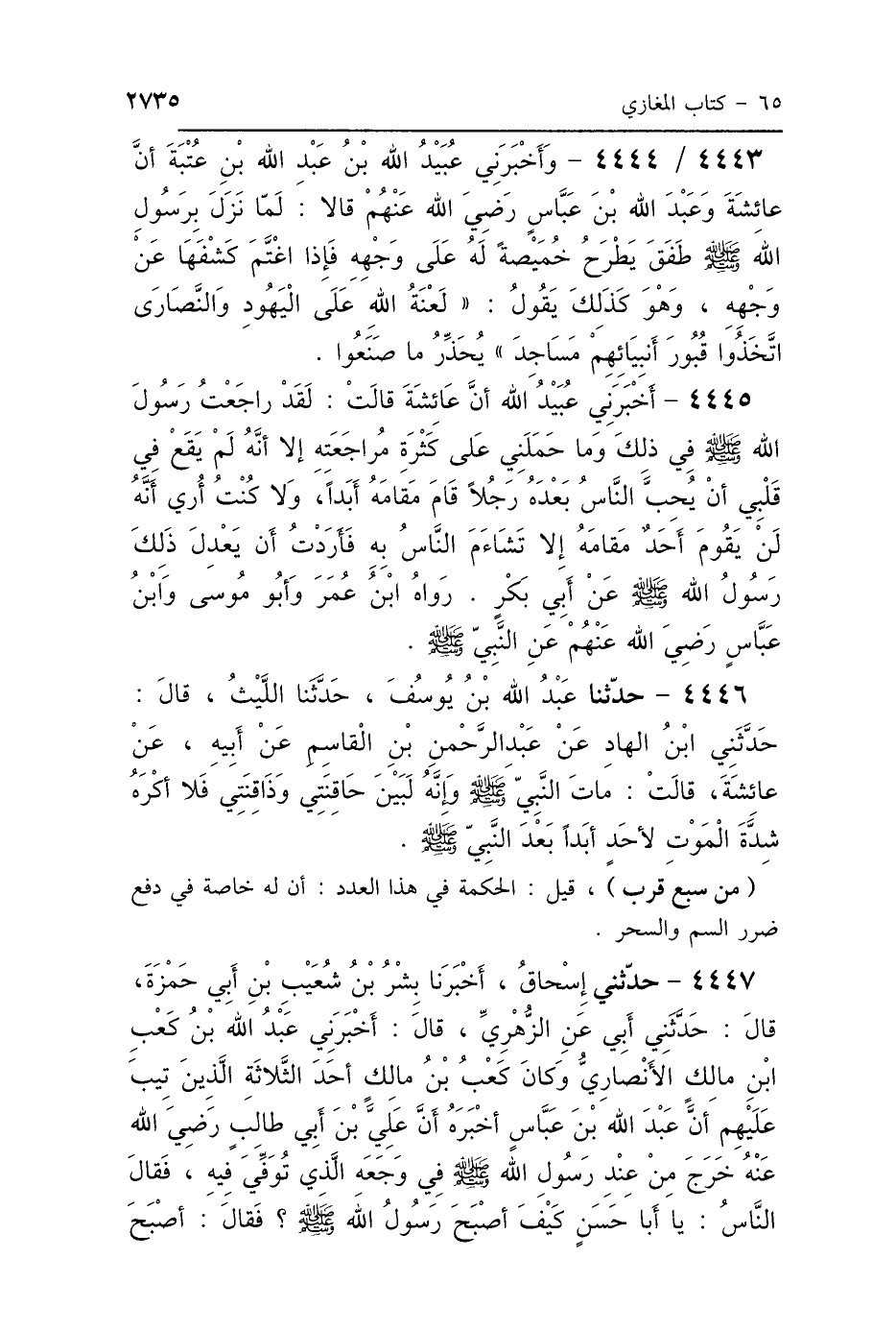 4447 - حَدَّثَنِي إِسْحَاقُ، أَخْبَرَنَا بِشْرُ بْنُ شُعَيْبِ بْنِ أَبِي حَمْزَةَ، قَالَ: حَدَّثَنِي أَبِي، عَنِ الزُّهْرِيِّ، قَالَ: أَخْبَرَنِي عَبْدُ اللَّهِ بْنُ كَعْبِ بْنِ مَالِكٍ الأَنْصَارِيُّ، وَكَانَ كَعْبُ بْنُ مَالِكٍ أَحَدَ الثَّلاَثَةِ الَّذِينَ تِيبَ عَلَيْهِمْ أَنَّ عَبْدَ اللَّهِ بْنَ عَبَّاسٍ، أَخْبَرَهُ أَنَّ عَلِيَّ بْنَ أَبِي طَالِبٍ رَضِيَ اللَّهُ عَنْهُ، خَرَجَ مِنْ عِنْدِ رَسُولِ اللَّهِ صَلَّى اللهُ عَلَيْهِ وَسَلَّمَ فِي وَجَعِهِ الَّذِي تُوُفِّيَ فِيهِ، فَقَالَ النَّاسُ: يَا أَبَا حَسَنٍ، " كَيْفَ أَصْبَحَ رَسُولُ اللَّهِ صَلَّى اللهُ عَلَيْهِ وَسَلَّمَ؟، فَقَالَ: أَصْبَحَ