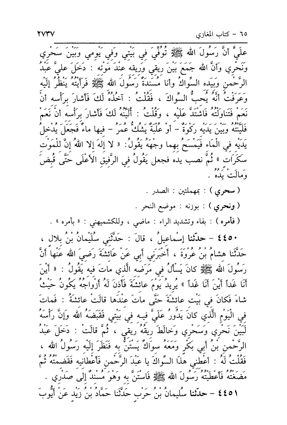 4450 - حَدَّثَنَا إِسْمَاعِيلُ، قَالَ: حَدَّثَنِي سُلَيْمَانُ بْنُ بِلاَلٍ، حَدَّثَنَا هِشَامُ بْنُ عُرْوَةَ، أَخْبَرَنِي أَبِي، عَنْ عَائِشَةَ رَضِيَ اللَّهُ عَنْهَا، أَنَّ رَسُولَ اللَّهِ صَلَّى اللهُ عَلَيْهِ وَسَلَّمَ كَانَ يَسْأَلُ فِي مَرَضِهِ الَّذِي مَاتَ فِيهِ، يَقُولُ: «أَيْنَ أَنَا غَدًا، أَيْنَ أَنَا غَدًا» يُرِيدُ يَوْمَ عَائِشَةَ، فَأَذِنَ لَهُ أَزْوَاجُهُ يَكُونُ حَيْثُ شَاءَ، فَكَانَ فِي بَيْتِ عَائِشَةَ حَتَّى مَاتَ عِنْدَهَا، قَالَتْ عَائِشَةُ: فَمَاتَ فِي اليَوْمِ الَّذِي كَانَ يَدُورُ عَلَيَّ فِيهِ، فِي بَيْتِي، فَقَبَضَهُ اللَّهُ وَإِنَّ رَأْسَهُ لَبَيْنَ نَحْرِي وَسَحْرِي، وَخَالَطَ رِيقُهُ رِيقِي، ثُمَّ قَالَتْ: دَخَلَ عَبْدُ الرَّحْمَنِ بْنُ أَبِي بَكْرٍ وَمَعَهُ سِوَاكٌ يَسْتَنُّ بِهِ، فَنَظَرَ إِلَيْهِ رَسُولُ اللَّهِ صَلَّى اللهُ عَلَيْهِ وَسَلَّمَ، فَقُلْتُ لَهُ: أَعْطِنِي هَذَا السِّوَاكَ يَا عَبْدَ الرَّحْمَنِ، فَأَعْطَانِيهِ، فَقَضِمْتُهُ، ثُمَّ مَضَغْتُهُ، فَأَعْطَيْتُهُ رَسُولَ اللَّهِ صَلَّى اللهُ عَلَيْهِ وَسَلَّمَ فَاسْتَنَّ بِهِ، وَهُوَ مُسْتَنِدٌ إِلَى صَدْرِي.