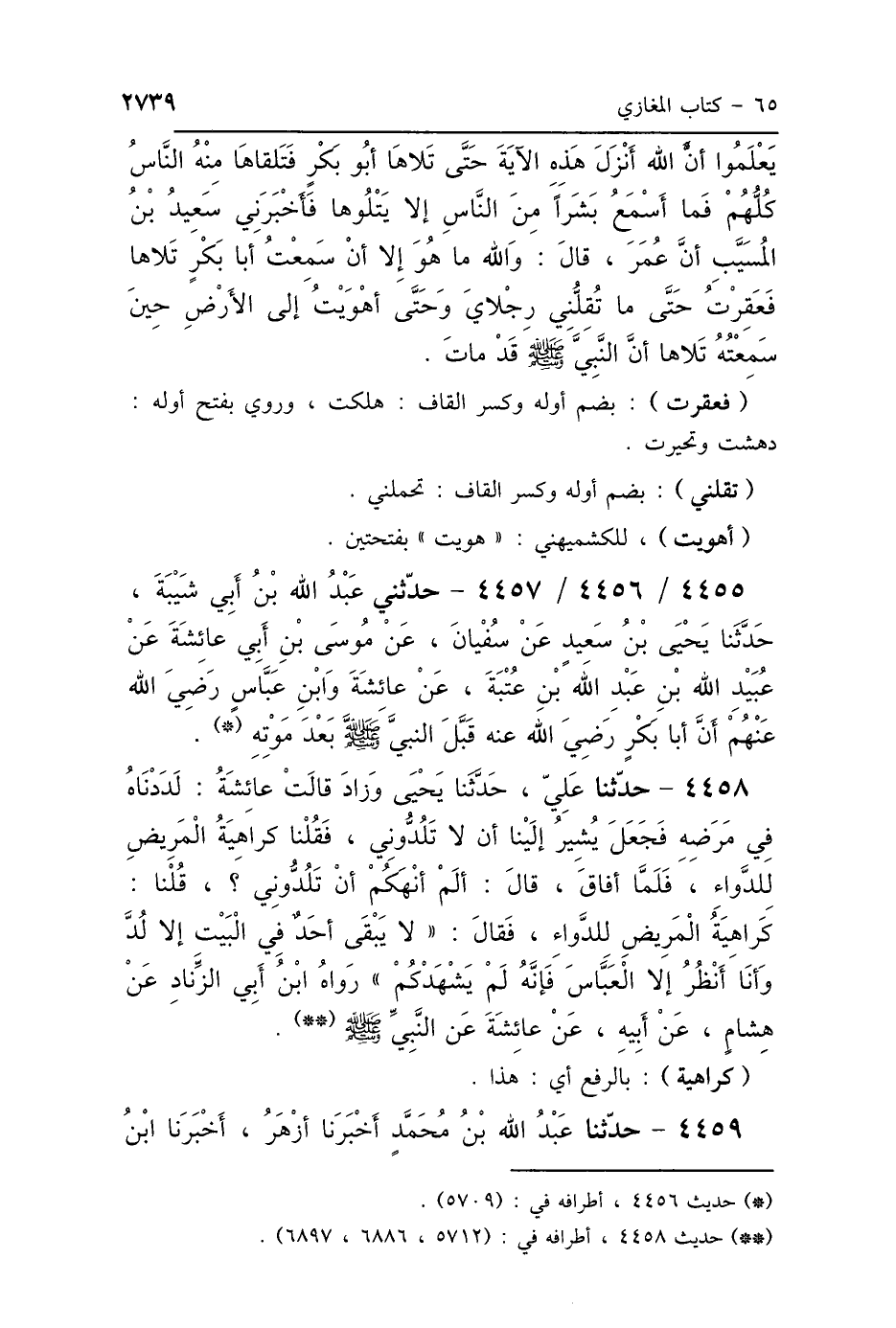 يَعْلَمُوا أَنَّ اللَّهَ أَنْزَلَ هَذِهِ الآيَةَ حَتَّى تَلاَهَا أَبُو بَكْرٍ، فَتَلَقَّاهَا مِنْهُ النَّاسُ كُلُّهُمْ، فَمَا أَسْمَعُ بَشَرًا مِنَ النَّاسِ إِلَّا يَتْلُوهَا " فَأَخْبَرَنِي سَعِيدُ بْنُ المُسَيِّبِ، أَنَّ عُمَرَ قَالَ: «وَاللَّهِ مَا هُوَ إِلَّا أَنْ سَمِعْتُ أَبَا بَكْرٍ تَلاَهَا فَعَقِرْتُ، حَتَّى مَا تُقِلُّنِي رِجْلاَيَ، وَحَتَّى أَهْوَيْتُ إِلَى الأَرْضِ حِينَ سَمِعْتُهُ تَلاَهَا، عَلِمْتُ أَنَّ النَّبِيَّ صَلَّى اللهُ عَلَيْهِ وَسَلَّمَ قَدْ مَاتَ».