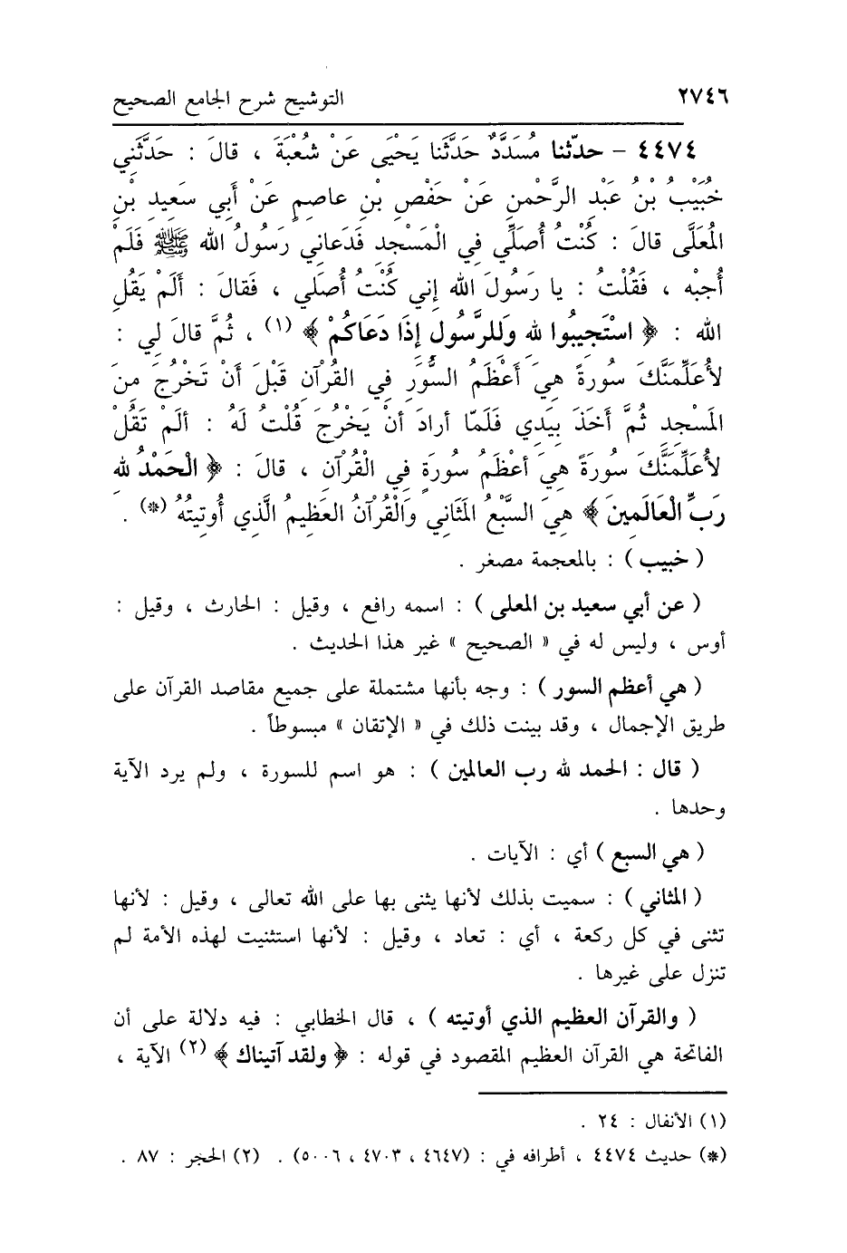 4474 - حَدَّثَنَا مُسَدَّدٌ، حَدَّثَنَا يَحْيَى، عَنْ شُعْبَةَ، قَالَ: حَدَّثَنِي خُبَيْبُ بْنُ عَبْدِ الرَّحْمَنِ، عَنْ حَفْصِ بْنِ عَاصِمٍ، عَنْ أَبِي سَعِيدِ بْنِ المُعَلَّى، قَالَ: كُنْتُ أُصَلِّي فِي المَسْجِدِ، فَدَعَانِي رَسُولُ اللَّهِ صَلَّى اللهُ عَلَيْهِ وَسَلَّمَ فَلَمْ أُجِبْهُ، فَقُلْتُ: يَا رَسُولَ اللَّهِ، إِنِّي كُنْتُ أُصَلِّي، فَقَالَ: " أَلَمْ يَقُلِ اللَّهُ: {اسْتَجِيبُوا لِلَّهِ وَلِلرَّسُولِ إِذَا دَعَاكُمْ لِمَا يُحْيِيكُمْ} [الأنفال: 24]. ثُمَّ قَالَ لِي: «لَأُعَلِّمَنَّكَ سُورَةً هِيَ أَعْظَمُ السُّوَرِ فِي القُرْآنِ، قَبْلَ أَنْ تَخْرُجَ مِنَ المَسْجِدِ». ثُمَّ أَخَذَ بِيَدِي، فَلَمَّا أَرَادَ أَنْ يَخْرُجَ، قُلْتُ لَهُ: «أَلَمْ تَقُلْ لَأُعَلِّمَنَّكَ سُورَةً هِيَ أَعْظَمُ سُورَةٍ فِي القُرْآنِ»، قَالَ: {الحَمْدُ لِلَّهِ رَبِّ العَالَمِينَ} [الفاتحة: 2] «هِيَ السَّبْعُ المَثَانِي، وَالقُرْآنُ العَظِيمُ الَّذِي أُوتِيتُهُ».