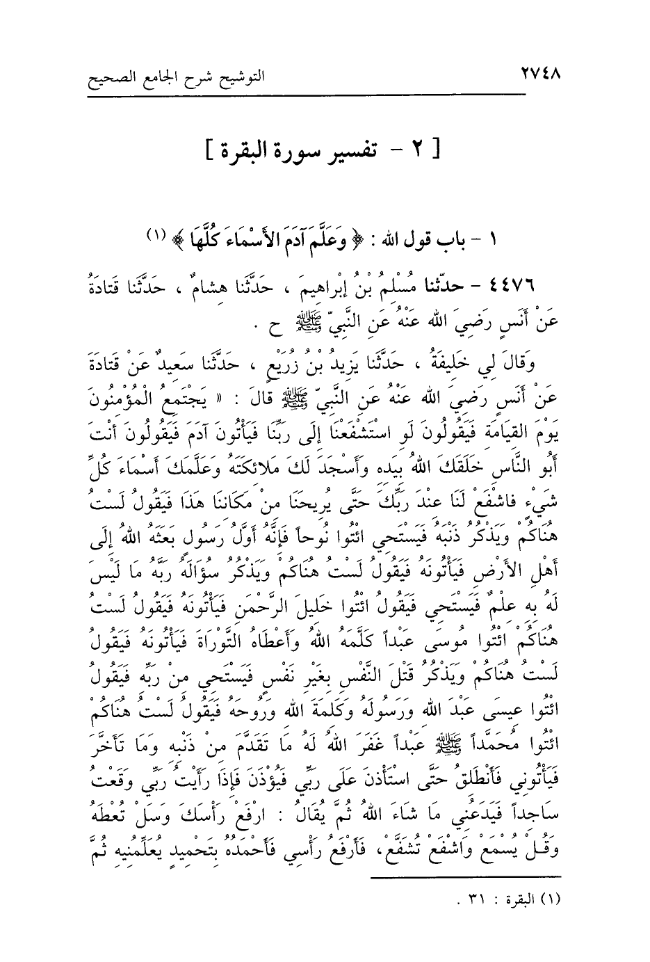 4476 - حَدَّثَنَا مُسْلِمُ بْنُ إِبْرَاهِيمَ، حَدَّثَنَا هِشَامٌ، حَدَّثَنَا قَتَادَةُ، عَنْ أَنَسٍ رَضِيَ اللَّهُ عَنْهُ، عَنِ النَّبِيِّ صَلَّى اللهُ عَلَيْهِ وَسَلَّمَ، ح وقَالَ لِي خَلِيفَةُ، حَدَّثَنَا يَزِيدُ بْنُ زُرَيْعٍ، حَدَّثَنَا سَعِيدٌ، عَنْ قَتَادَةَ، عَنْ أَنَسٍ رَضِيَ اللَّهُ عَنْهُ، عَنِ النَّبِيِّ صَلَّى اللهُ عَلَيْهِ وَسَلَّمَ، قَالَ: " يَجْتَمِعُ المُؤْمِنُونَ يَوْمَ القِيَامَةِ، فَيَقُولُونَ: لَوِ اسْتَشْفَعْنَا إِلَى رَبِّنَا، فَيَأْتُونَ آدَمَ فَيَقُولُونَ: أَنْتَ أَبُو النَّاسِ، خَلَقَكَ اللَّهُ بِيَدِهِ، وَأَسْجَدَ لَكَ مَلاَئِكَتَهُ، وَعَلَّمَكَ أَسْمَاءَ كُلِّ شَيْءٍ، فَاشْفَعْ لَنَا عِنْدَ رَبِّكَ حَتَّى يُرِيحَنَا مِنْ مَكَانِنَا هَذَا، فَيَقُولُ: لَسْتُ هُنَاكُمْ، وَيَذْكُرُ ذَنْبَهُ فَيَسْتَحِي، ائْتُوا نُوحًا، فَإِنَّهُ أَوَّلُ رَسُولٍ بَعَثَهُ اللَّهُ إِلَى أَهْلِ الأَرْضِ، فَيَأْتُونَهُ فَيَقُولُ: لَسْتُ هُنَاكُمْ، وَيَذْكُرُ سُؤَالَهُ رَبَّهُ مَا لَيْسَ لَهُ بِهِ عِلْمٌ فَيَسْتَحِي، فَيَقُولُ: ائْتُوا خَلِيلَ الرَّحْمَنِ، فَيَأْتُونَهُ فَيَقُولُ: لَسْتُ هُنَاكُمْ، ائْتُوا مُوسَى، عَبْدًا كَلَّمَهُ اللَّهُ وَأَعْطَاهُ التَّوْرَاةَ، فَيَأْتُونَهُ فَيَقُولُ: لَسْتُ هُنَاكُمْ، وَيَذْكُرُ قَتْلَ النَّفْسِ بِغَيْرِ نَفْسٍ، فَيَسْتَحِي مِنْ رَبِّهِ، فَيَقُولُ: ائْتُوا عِيسَى عَبْدَ اللَّهِ وَرَسُولَهُ، وَكَلِمَةَ اللَّهِ وَرُوحَهُ، فَيَقُولُ: لَسْتُ هُنَاكُمْ، ائْتُوا مُحَمَّدًا صَلَّى اللهُ عَلَيْهِ وَسَلَّمَ، عَبْدًا غَفَرَ اللَّهُ لَهُ مَا تَقَدَّمَ مِنْ ذَنْبِهِ وَمَا تَأَخَّرَ، فَيَأْتُونِي، فَأَنْطَلِقُ حَتَّى أَسْتَأْذِنَ عَلَى رَبِّي، فَيُؤْذَنَ لِي، فَإِذَا رَأَيْتُ رَبِّي وَقَعْتُ سَاجِدًا، فَيَدَعُنِي مَا شَاءَ اللَّهُ، ثُمَّ يُقَالُ: ارْفَعْ رَأْسَكَ وَسَلْ تُعْطَهْ، وَقُلْ يُسْمَعْ وَاشْفَعْ تُشَفَّعْ، فَأَرْفَعُ رَأْسِي، فَأَحْمَدُهُ بِتَحْمِيدٍ يُعَلِّمُنِيهِ، ثُمَّ