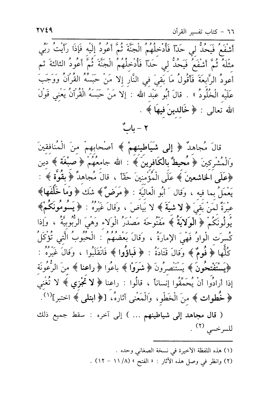 قَالَ مُجَاهِدٌ: {إِلَى شَيَاطِينِهِمْ} [البقرة: 14] «أَصْحَابِهِمْ مِنَ المُنَافِقِينَ وَالمُشْرِكِينَ» {مُحِيطٌ بِالكَافِرِينَ} [البقرة: 19]: «اللَّهُ جَامِعُهُمْ» {عَلَى الخَاشِعِينَ} [البقرة: 45]: «عَلَى المُؤْمِنِينَ حَقًّا» قَالَ مُجَاهِدٌ: {بِقُوَّةٍ} [البقرة: 63]: «يَعْمَلُ بِمَا فِيهِ» وَقَالَ أَبُو العَالِيَةِ: {مَرَضٌ} [البقرة: 10]: «شَكٌّ» {وَمَا خَلْفَهَا} [البقرة: 66]: «عِبْرَةٌ لِمَنْ بَقِيَ» {لاَ شِيَةَ} [البقرة: 71]: «لاَ بَيَاضَ» وَقَالَ غَيْرُهُ: {يَسُومُونَكُمْ} [البقرة: 49]: " يُولُونَكُمُ الوَلاَيَةُ، - مَفْتُوحَةٌ - مَصْدَرُ الوَلاَءِ، وَهِيَ الرُّبُوبِيَّةُ، إِذَا كُسِرَتِ الوَاوُ فَهِيَ الإِمَارَةُ، وَقَالَ بَعْضُهُمْ: الحُبُوبُ الَّتِي تُؤْكَلُ كُلُّهَا فُومٌ " وَقَالَ قَتَادَةُ: {فَبَاءُوا}: «فَانْقَلَبُوا» وَقَالَ غَيْرُهُ: {يَسْتَفْتِحُونَ} [البقرة: 89]: يَسْتَنْصِرُونَ، {شَرَوْا} [البقرة: 102]: بَاعُوا، {رَاعِنَا} [البقرة: 104]: مِنَ الرُّعُونَةِ، إِذَا أَرَادُوا أَنْ يُحَمِّقُوا إِنْسَانًا، قَالُوا: رَاعِنًا، {لاَ يَجْزِي} [لقمان: 33]: لاَ يُغْنِي، {خُطُوَاتِ} [البقرة: 168]: مِنَ الخَطْوِ، وَالمَعْنَى: آثَارَهُ {ابْتَلَى} [البقرة: 124]: اخْتَبَرَ".