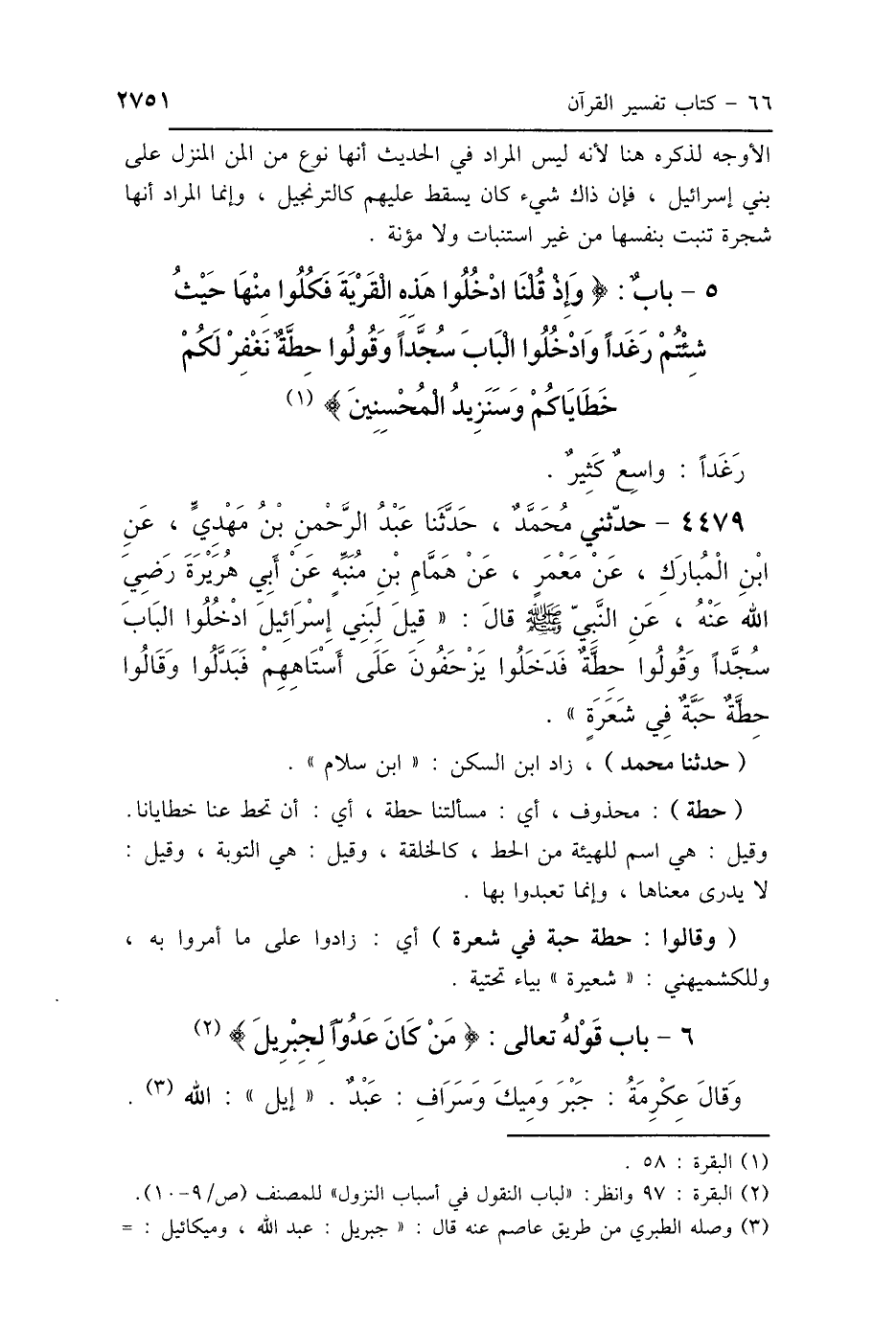 4479 - حَدَّثَنِي مُحَمَّدٌ، حَدَّثَنَا عَبْدُ الرَّحْمَنِ بْنُ مَهْدِيٍّ، عَنِ ابْنِ المُبَارَكِ، عَنْ مَعْمَرٍ، عَنْ هَمَّامِ بْنِ مُنَبِّهٍ، عَنْ أَبِي هُرَيْرَةَ رَضِيَ اللَّهُ عَنْهُ، عَنِ النَّبِيِّ صَلَّى اللهُ عَلَيْهِ وَسَلَّمَ، قَالَ: " قِيلَ لِبَنِي إِسْرَائِيلَ: {ادْخُلُوا البَابَ سُجَّدًا وَقُولُوا حِطَّةٌ} [البقرة: 58]. فَدَخَلُوا يَزْحَفُونَ عَلَى أَسْتَاهِهِمْ، فَبَدَّلُوا، وَقَالُوا: حِطَّةٌ، حَبَّةٌ فِي شَعَرَةٍ".