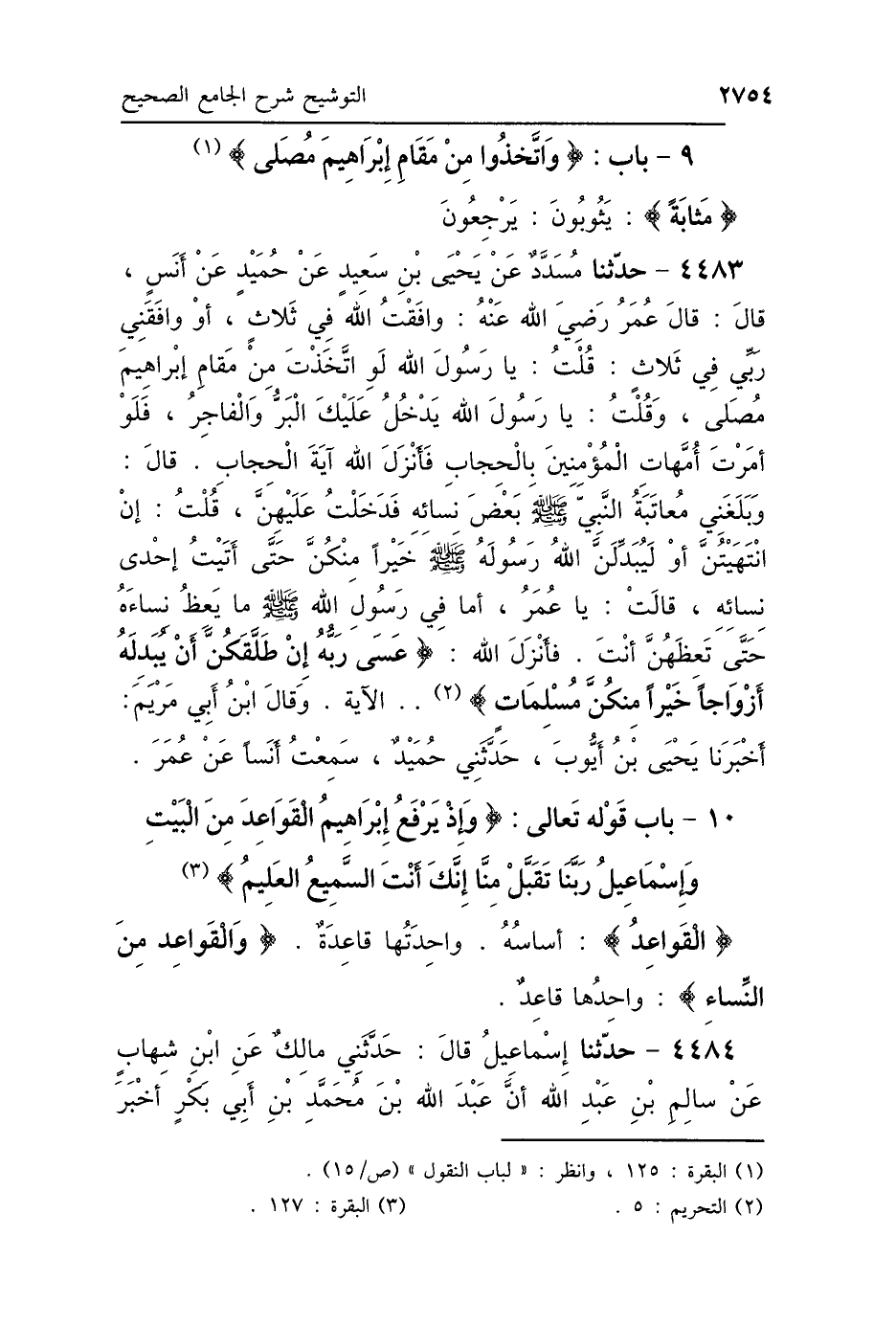 4483 - حَدَّثَنَا مُسَدَّدٌ، عَنْ يَحْيَى بْنِ سَعِيدٍ، عَنْ حُمَيْدٍ، عَنْ أَنَسٍ، قَالَ: قَالَ عُمَرُ: " وَافَقْتُ اللَّهَ فِي ثَلاَثٍ، أَوْ وَافَقَنِي رَبِّي فِي ثَلاَثٍ، قُلْتُ: يَا رَسُولَ اللَّهِ لَوِ اتَّخَذْتَ مَقَامَ إِبْرَاهِيمَ مُصَلًّى، وَقُلْتُ: يَا رَسُولَ اللَّهِ، يَدْخُلُ عَلَيْكَ البَرُّ وَالفَاجِرُ، فَلَوْ أَمَرْتَ أُمَّهَاتِ المُؤْمِنِينَ بِالحِجَابِ، فَأَنْزَلَ اللَّهُ آيَةَ الحِجَابِ، قَالَ: وَبَلَغَنِي مُعَاتَبَةُ النَّبِيِّ صَلَّى اللهُ عَلَيْهِ وَسَلَّمَ بَعْضَ نِسَائِهِ، فَدَخَلْتُ عَلَيْهِنَّ، قُلْتُ: إِنِ انْتَهَيْتُنَّ أَوْ لَيُبَدِّلَنَّ اللَّهُ رَسُولَهُ صَلَّى اللهُ عَلَيْهِ وَسَلَّمَ خَيْرًا مِنْكُنَّ، حَتَّى أَتَيْتُ إِحْدَى نِسَائِهِ، قَالَتْ: يَا عُمَرُ، أَمَا فِي رَسُولِ اللَّهِ صَلَّى اللهُ عَلَيْهِ وَسَلَّمَ مَا يَعِظُ نِسَاءَهُ، حَتَّى تَعِظَهُنَّ أَنْتَ؟ فَأَنْزَلَ اللَّهُ: (عَسَى رَبُّهُ إِنْ طَلَّقَكُنَّ أَنْ يُبَدِّلَهُ أَزْوَاجًا خَيْرًا مِنْكُنَّ مُسْلِمَاتٍ) الآيَةَ " وَقَالَ ابْنُ أَبِي مَرْيَمَ، أَخْبَرَنَا يَحْيَى بْنُ أَيُّوبَ، حَدَّثَنِي حُمَيْدٌ، سَمِعْتُ أَنَسًا، عَنْ عُمَرَ.