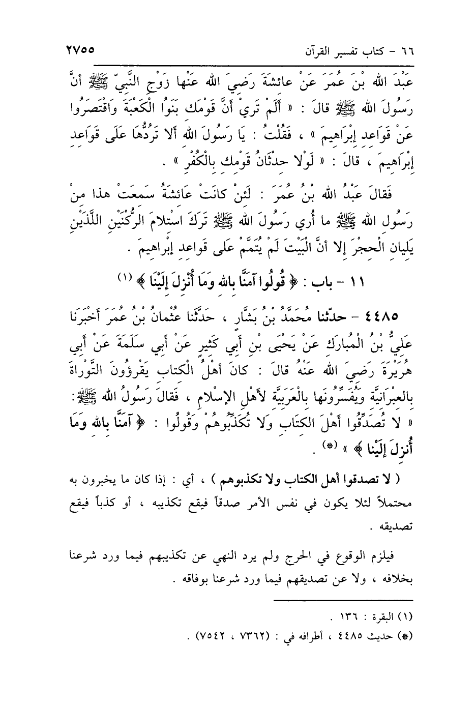 4485 - حَدَّثَنَا مُحَمَّدُ بْنُ بَشَّارٍ، حَدَّثَنَا عُثْمَانُ بْنُ عُمَرَ، أَخْبَرَنَا عَلِيُّ بْنُ المُبَارَكِ، عَنْ يَحْيَى بْنِ أَبِي كَثِيرٍ، عَنْ أَبِي سَلَمَةَ، عَنْ أَبِي هُرَيْرَةَ رَضِيَ اللَّهُ عَنْهُ، قَالَ: كَانَ أَهْلُ الكِتَابِ يَقْرَءُونَ التَّوْرَاةَ بِالعِبْرَانِيَّةِ، وَيُفَسِّرُونَهَا بِالعَرَبِيَّةِ لِأَهْلِ الإِسْلاَمِ، فَقَالَ رَسُولُ اللَّهِ صَلَّى اللهُ عَلَيْهِ وَسَلَّمَ: " لا تُصَدِّقُوا أَهْلَ الكِتَابِ وَلا تُكَذِّبُوهُمْ، وَقُولُوا: {آمَنَّا بِاللَّهِ وَمَا أُنْزِلَ إِلَيْنَا} [البقرة: 136] الآيَةَ.