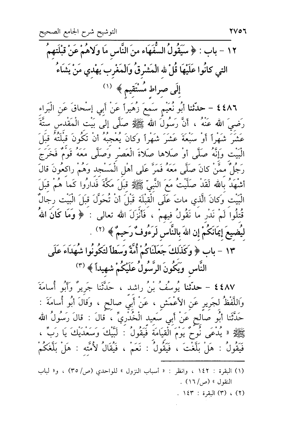 12 - بَابُ قَوْلِهِ تَعَالَى: {سَيَقُولُ السُّفَهَاءُ مِنَ النَّاسِ مَا وَلَّاهُمْ عَنْ قِبْلَتِهِمُ الَّتِي كَانُوا عَلَيْهَا قُلْ لِلَّهِ المَشْرِقُ وَالمَغْرِبُ يَهْدِي مَنْ يَشَاءُ إِلَى صِرَاطٍ مُسْتَقِيمٍ} [البقرة: 142]