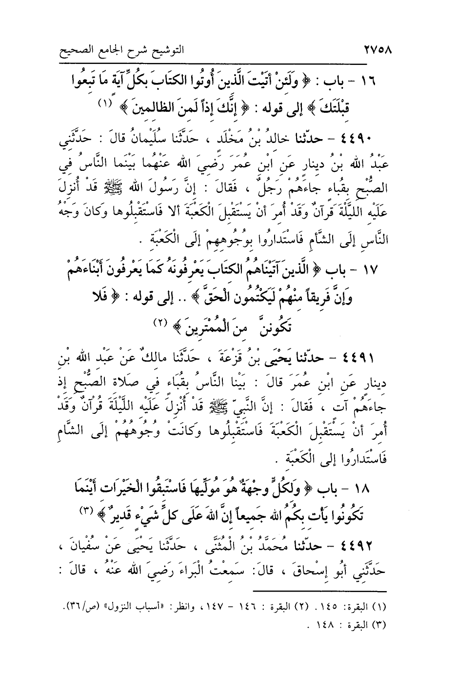 17 - بَابُ {الَّذِينَ آتَيْنَاهُمُ الكِتَابَ يَعْرِفُونَهُ كَمَا يَعْرِفُونَ أَبْنَاءَهُمْ وَإِنَّ فَرِيقًا مِنْهُمْ لَيَكْتُمُونَ الحَقَّ} [البقرة: 146]- إِلَى قَوْلِهِ - {فَلاَ تَكُونَنَّ مِنَ المُمْتَرِينَ} [البقرة: 147]