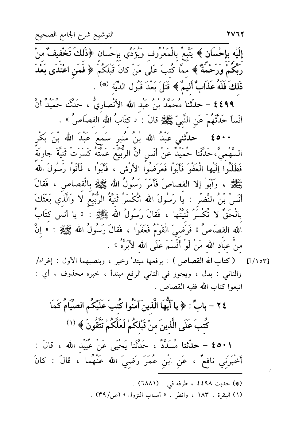 (كتاب الله القصاص): برفعها مبتدأ وخبر، وبنصبهما الأول: إغراء والثاني: بدل، ويجوز في الثاني الرفع مبتدأ، خبره محذوف، أي: اتبعوا كتاب الله ففيه القصاص.